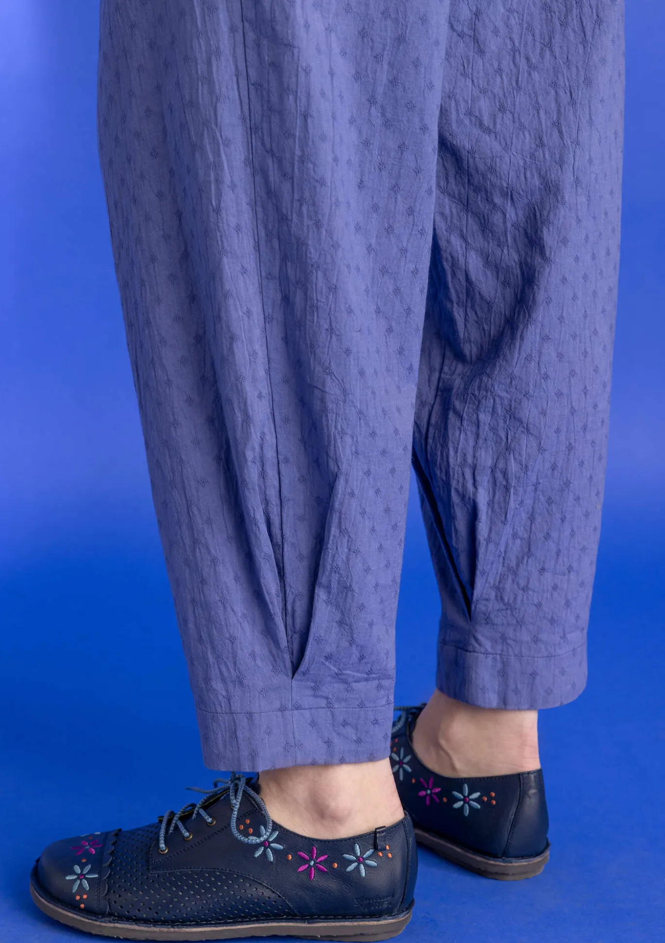 Nilkkapituinen malli. Materiaali on dobby-kudosta, joka luo yksiväriseen vaatteeseen eläväpintaista struktuuria. Lahkeensuissa kevyttä pussimaista muotoa antavat vastalaskokset. Sivuissa taskut ja vyötäröllä mukava resori.