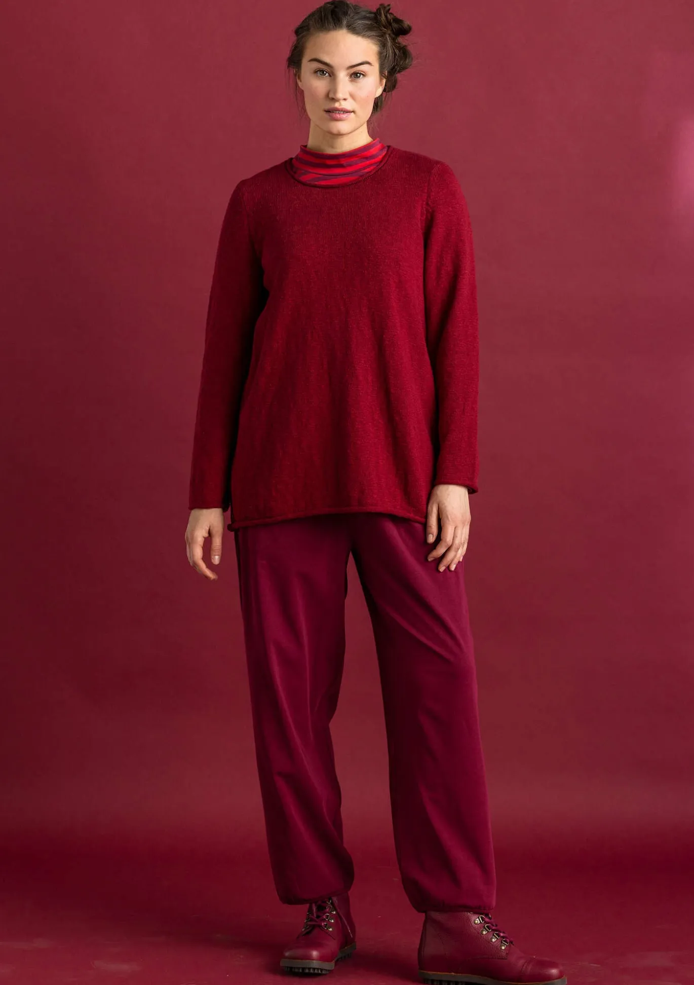 Neulottu kauniista slubilangasta. Neuloksen pinta on epäsäännöllisen tuntuinen – juuri siitä me pidämme. Valittavana sekä yksivärisiä että raidallisia. Pääntiessä, hihansuissa ja helmassa kiertyvät reunat.