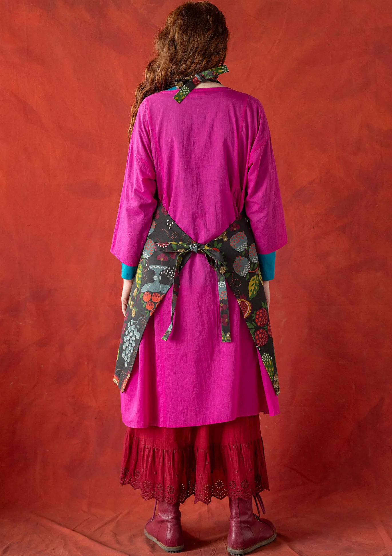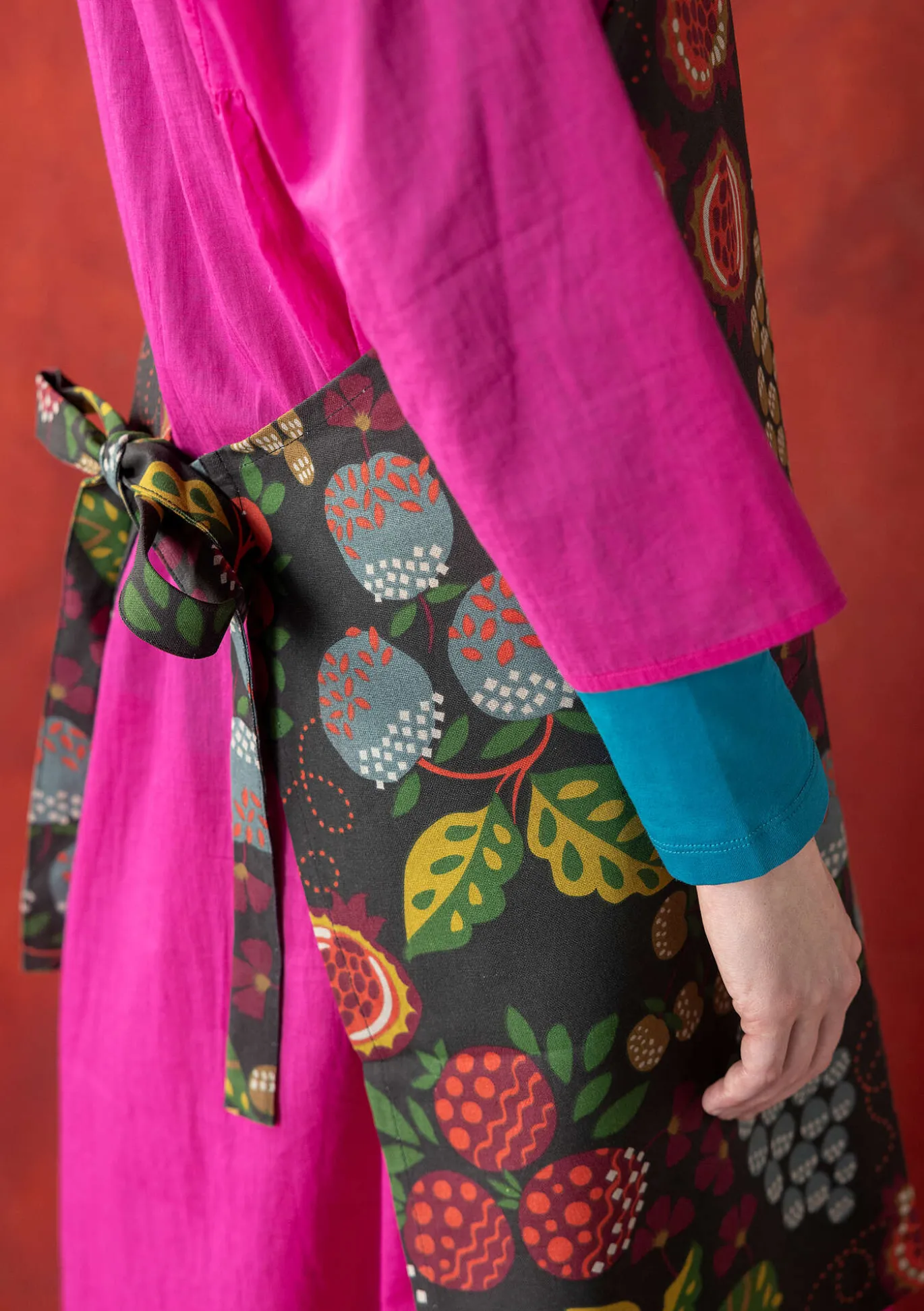 Kaunista esiliinaa somistaa näyttävä ”Fruits”-painokuvio. Kokoa on helppo säätää kaulan ympärille ja vyötärölle solmittavan nauhan avulla. Tasku edessä.