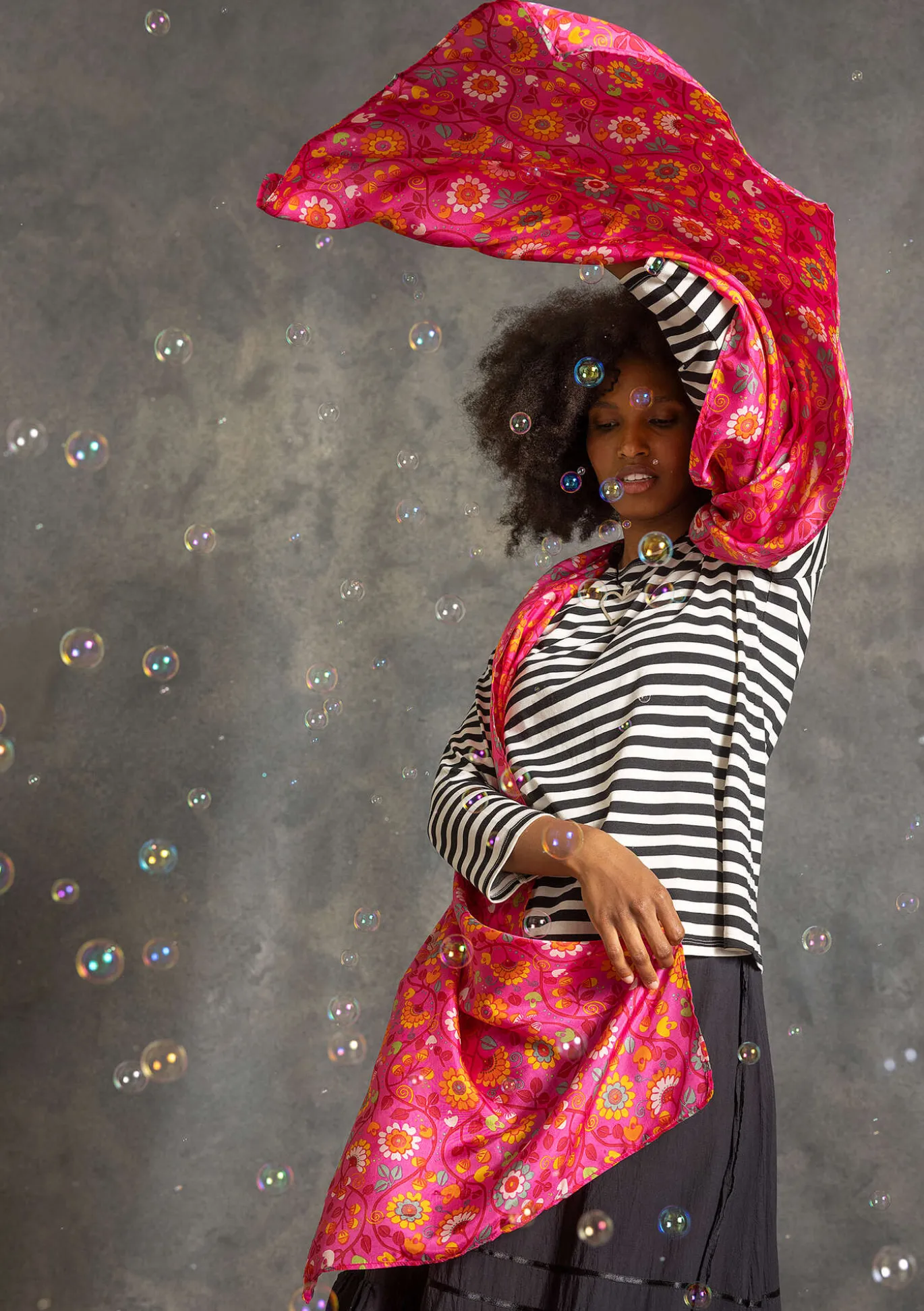 Ihana silkkihuivi, jonka runsaassa kuviossa on köynnöstäviä kukkia ja lehtiä.