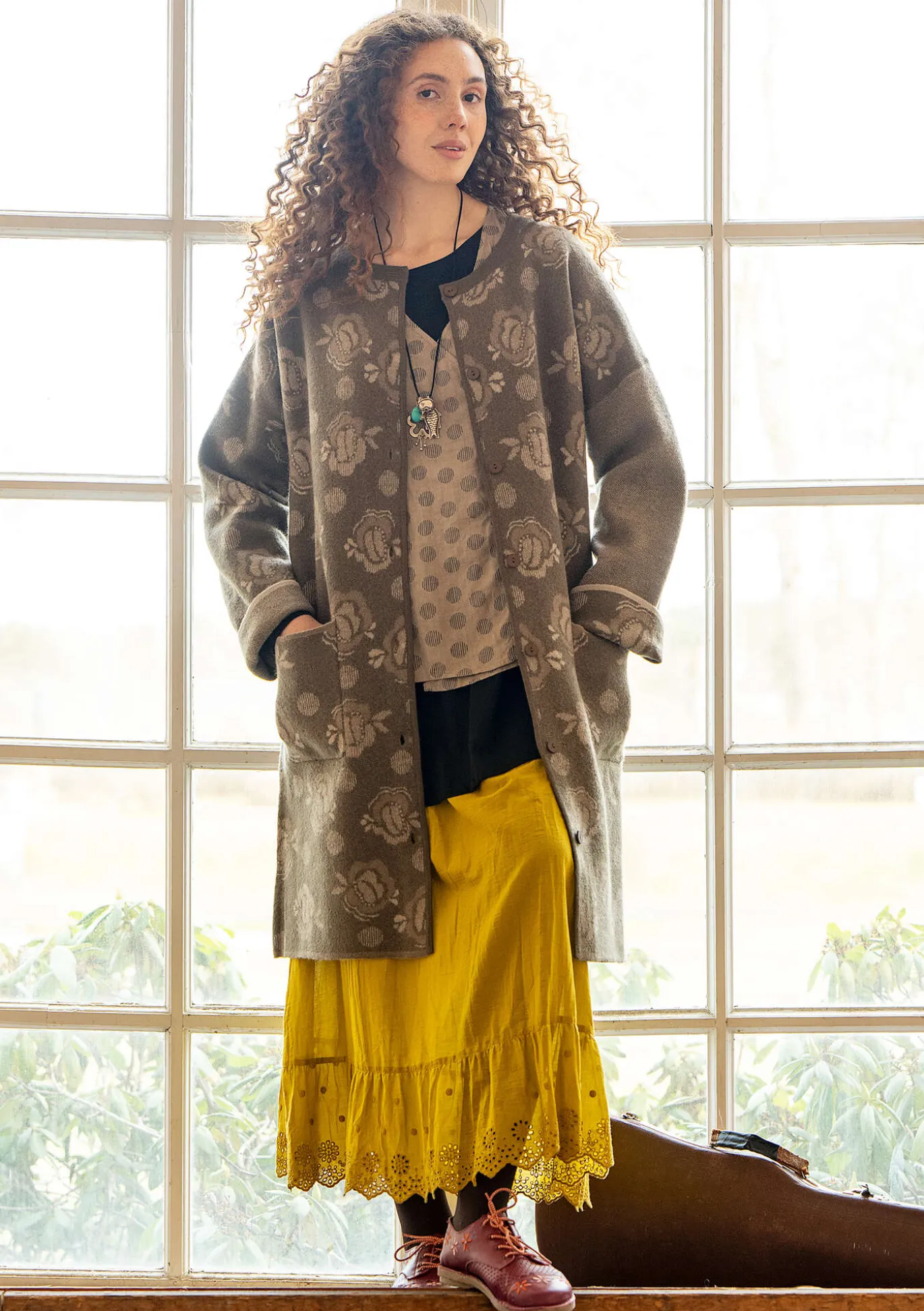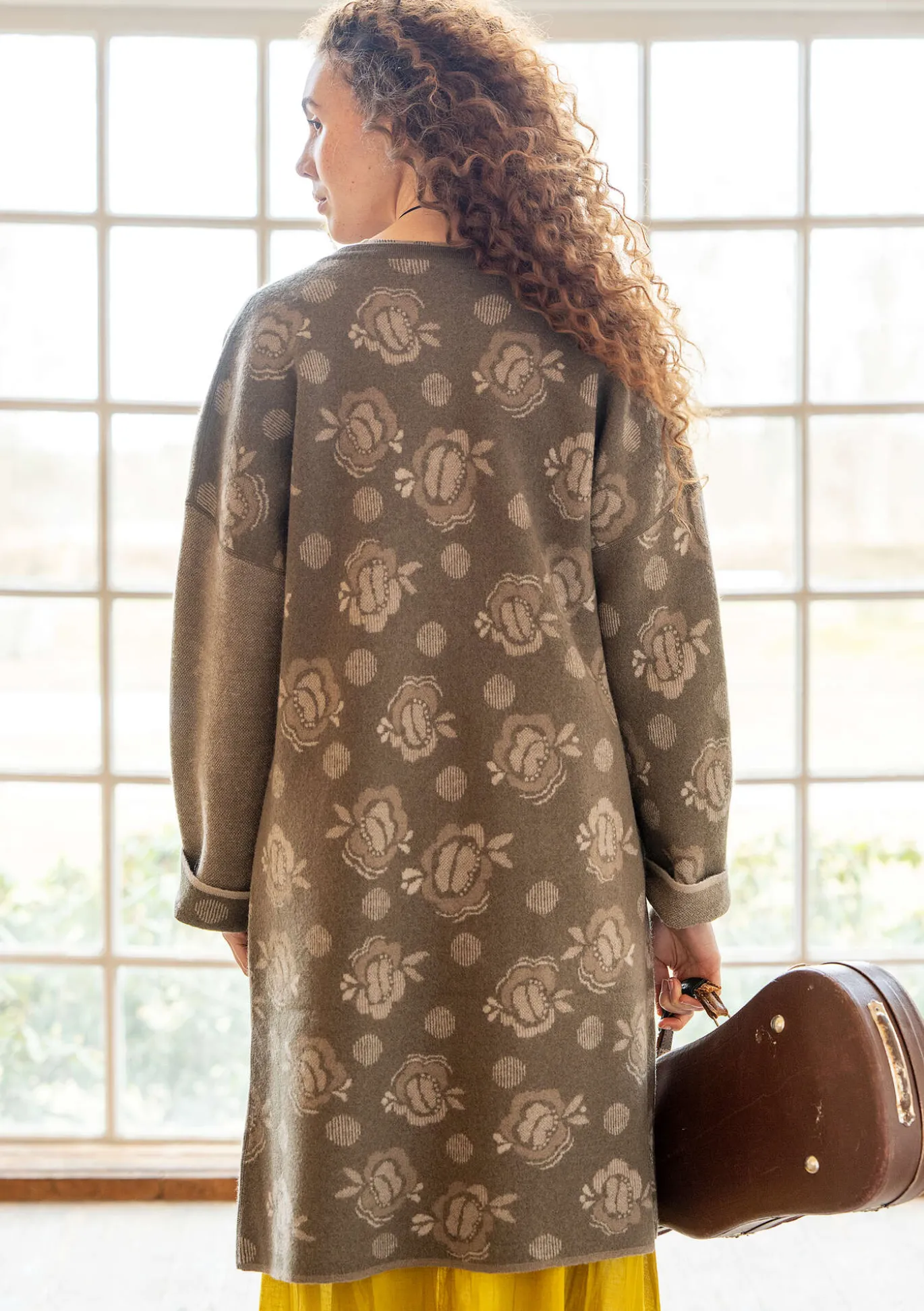 Käännettävä, jacquardneulottu takki huovutettua ekovillaa. Toinen puoli on ruusukuvioitu ja toinen yksivärinen meleerattu. Toisessa hihassa on kääntöpuolen kuosi. Laskettu hartialinja ja pyöreä pääntie. Molemmilla puolilla paikkataskut.