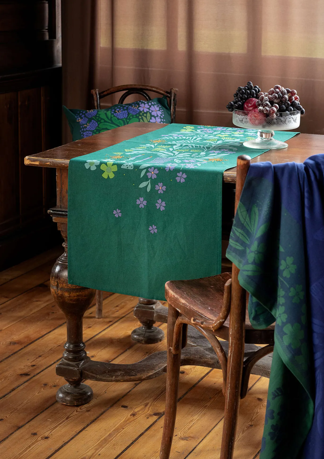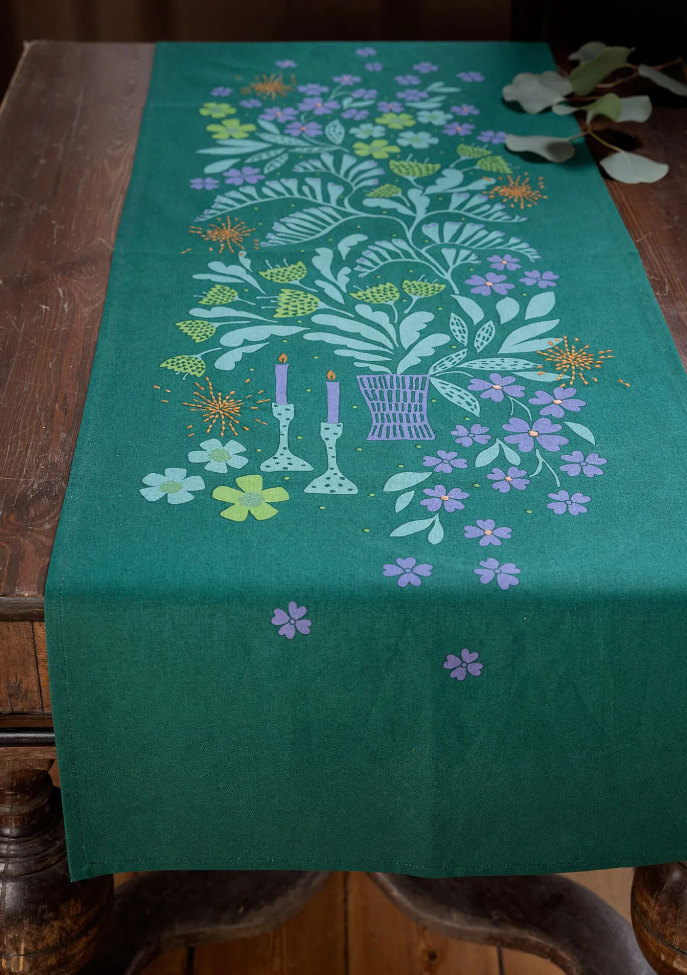 Ihastuttava kaitaliina, jossa on rehevä kukista ja kynttilänjaloista koostuva painokuvio ja kimaltavia kirjailtuja yksityiskohtia. Sopii sekä paljaalle pöydälle että pöytäliinan päälle.