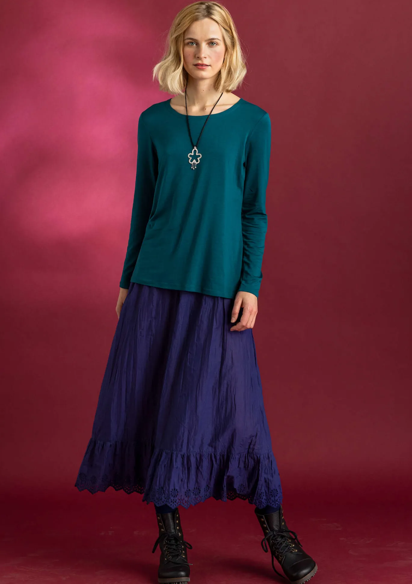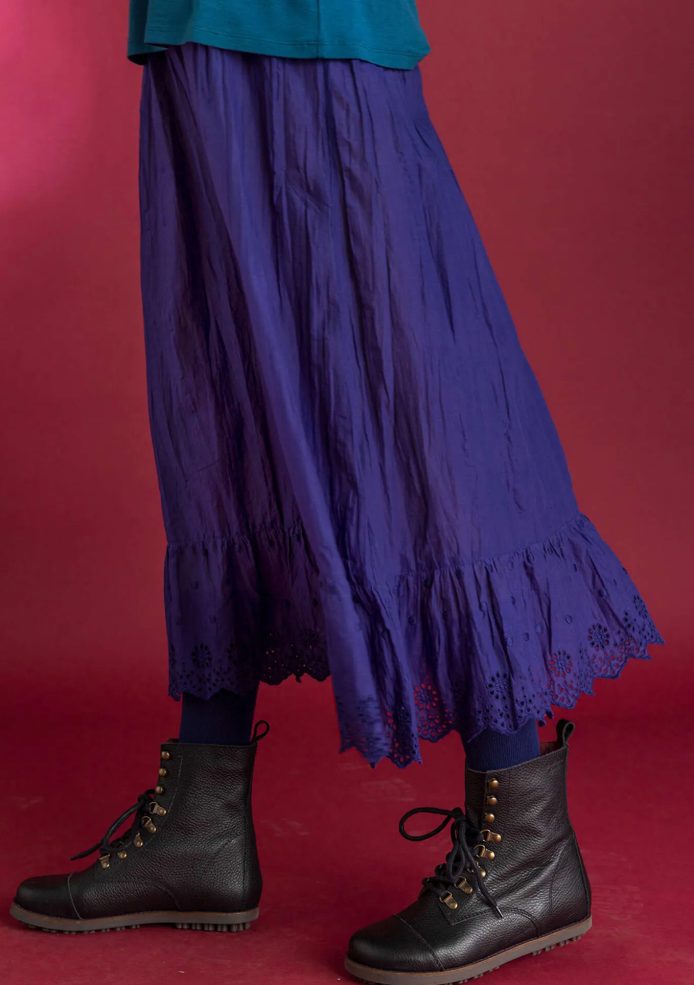 Pelkistetty malli, jossa on vyötäröresori ja kirjailtuja pilkkuja sekä helmassa reikäkirjailuja. Vyötärön resoria voidaan tarvittaessa säätää pienellä napilla.