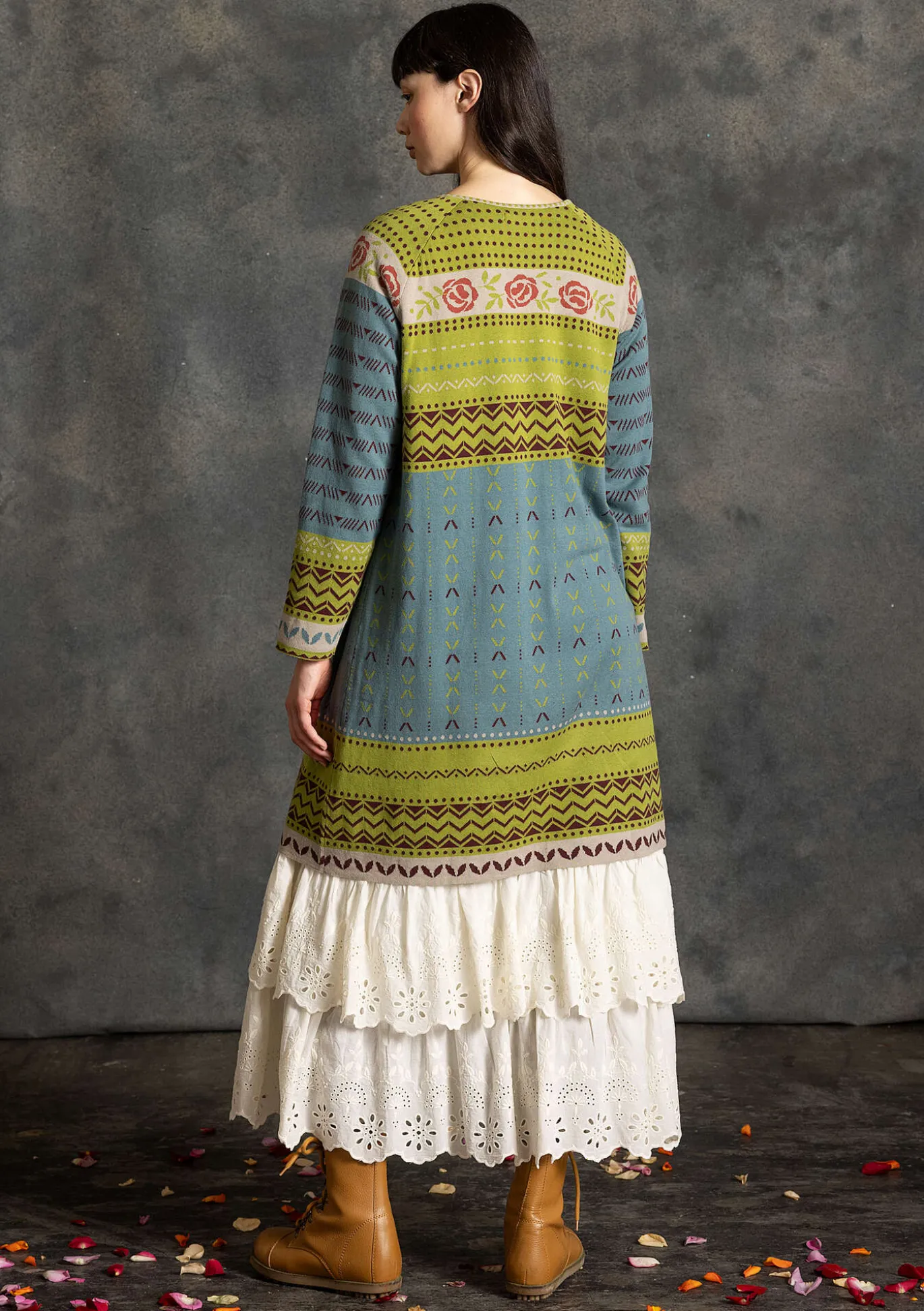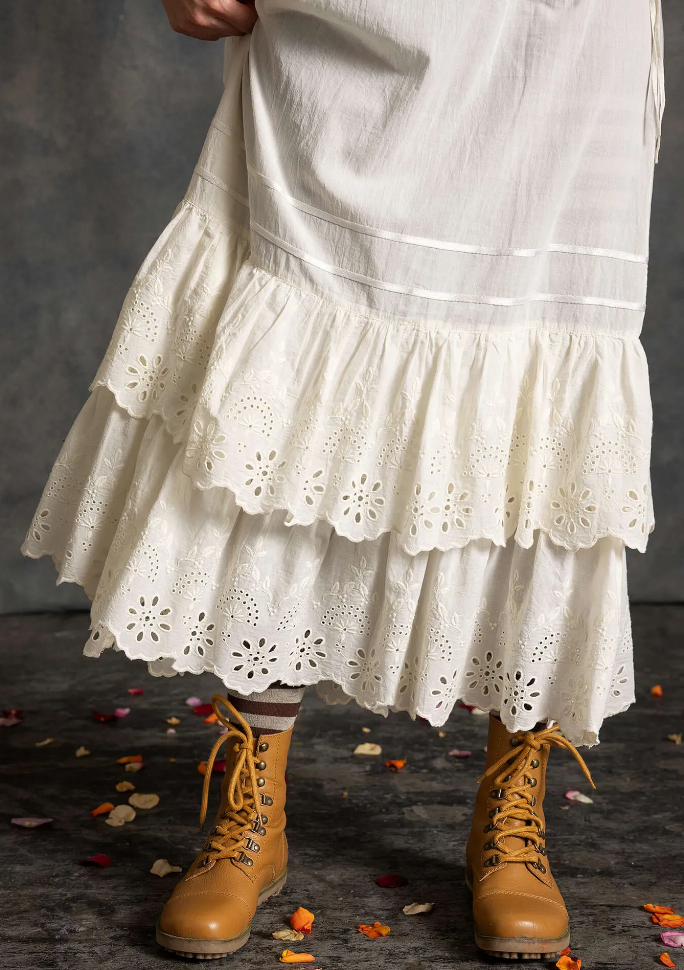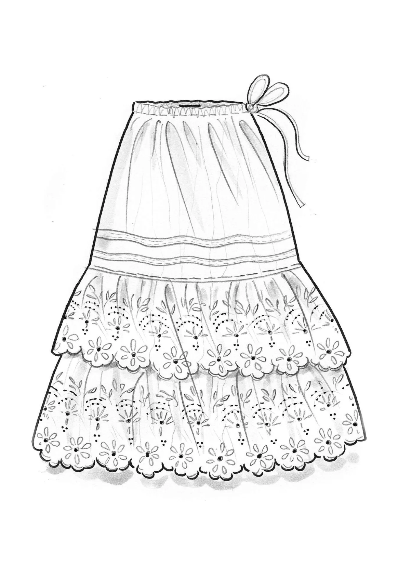 Koristeellinen mekko sopii käytettäväksi sellaisenaan tai alushameen kanssa. Kaksi mallia, joissa on reikäkirjailuja ja kerroksittain aseteltuja kaitaleita. Kaitaleiden yläpuolelle on ommeltu kaksi riviä satiininauhaa. Vyötäröllä on resori ja kiristysnyöri.