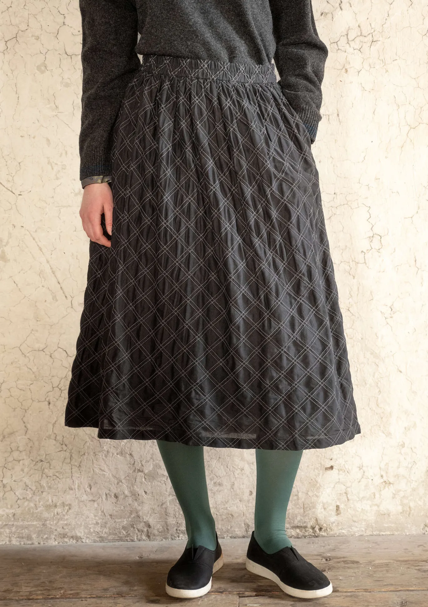 Kauttaaltaan kirjailtu hame, jossa on hieno ruutukuvio sävy sävyyn. Vyötäröllä ommeltu resori, sivuissa käytännölliset taskut.
