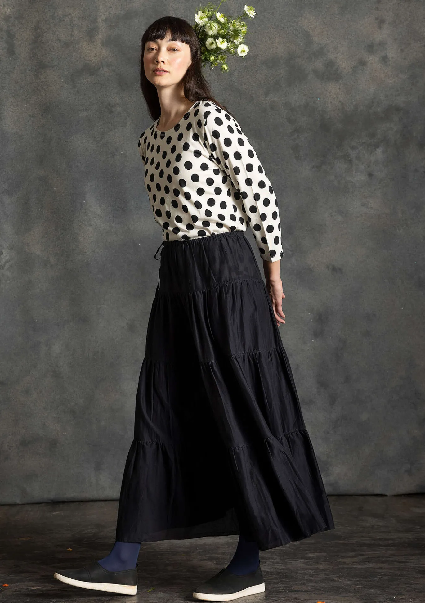 Hame ihanaa puuvilla-silkkisekoitekangasta, joka laskeutuu kauniisti. Erittäin väljä malli. Neljästä kaitaleesta ommeltu upea mekko, jonka vyötäröllä on kiristysnyöri ja mukava resori.