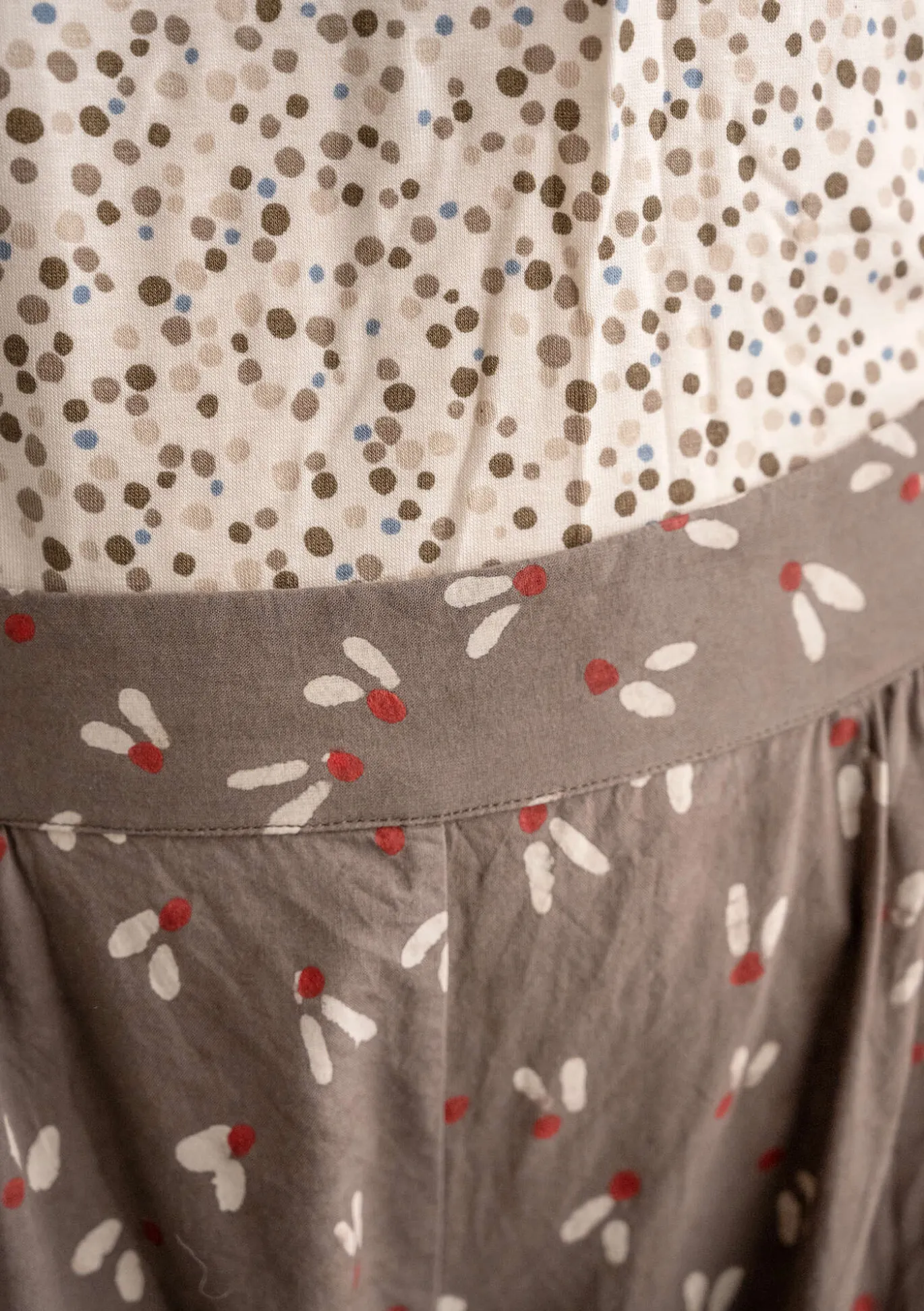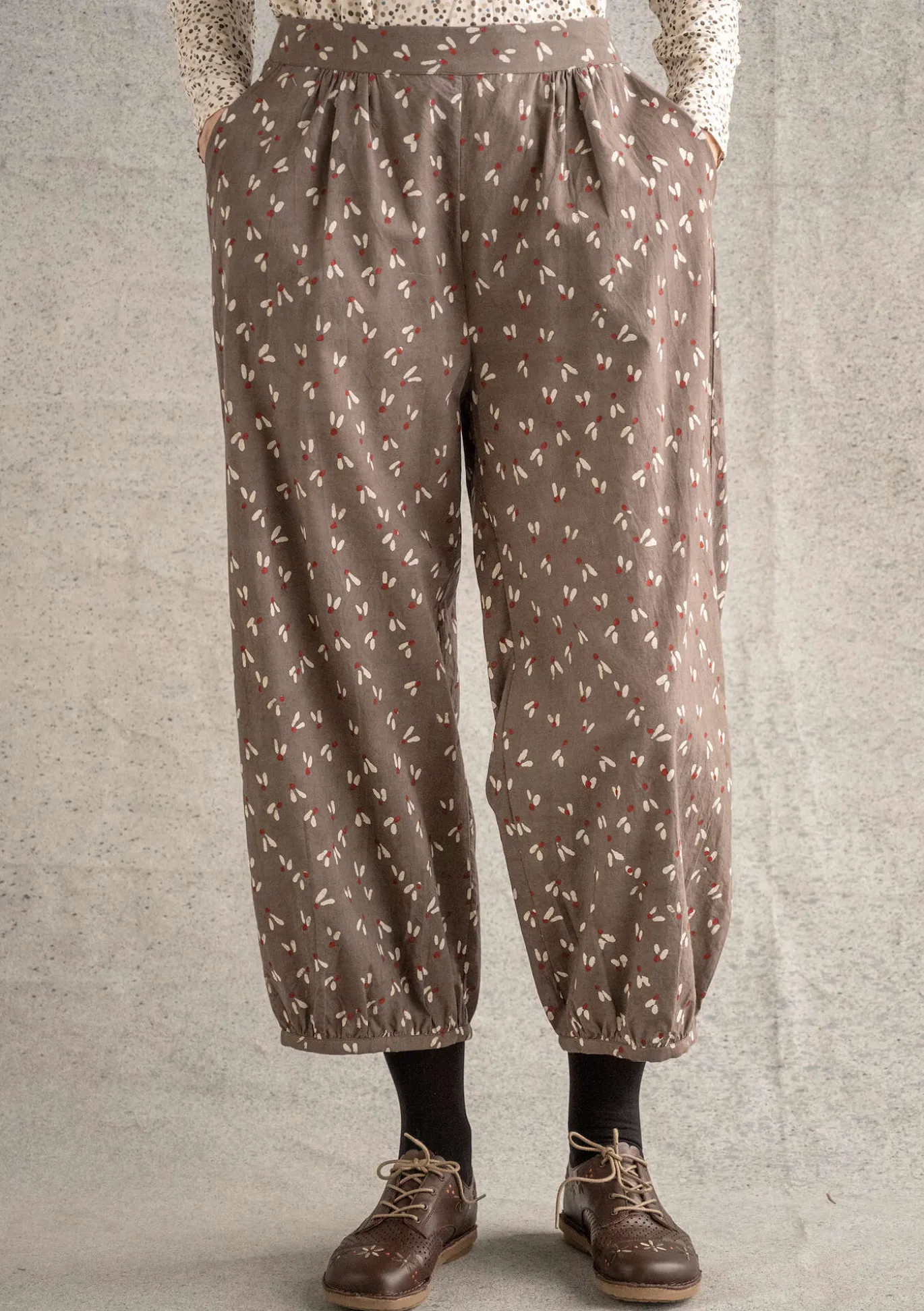 Pienikuvioiset pussihousut, jotka on laattapainettu savella ja kastettu värialtaisiin, joissa on eri kasvipigmenttejä. Vyötäröllä ommeltu resori ja sivuissa käytännölliset taskut.