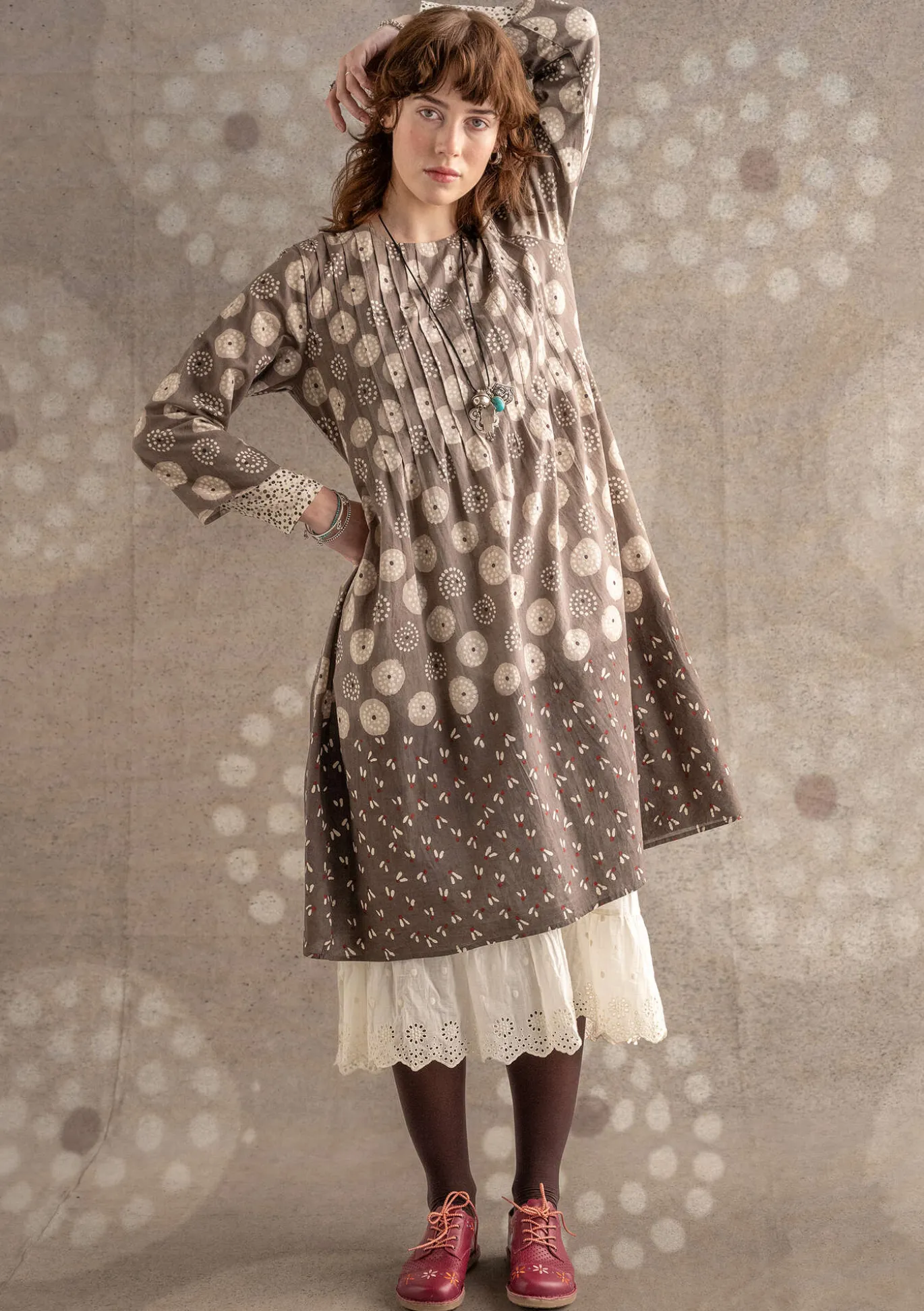 Laattapainettu mekko, jossa on kaksi savella laattapainettua kuviota ja joka on värjätty kasvipigmenteillä. Miehustassa hiuslaskokset sekä edessä että takana. Yksi puunappi niskassa. 3/4-hihat ja sivutaskut.