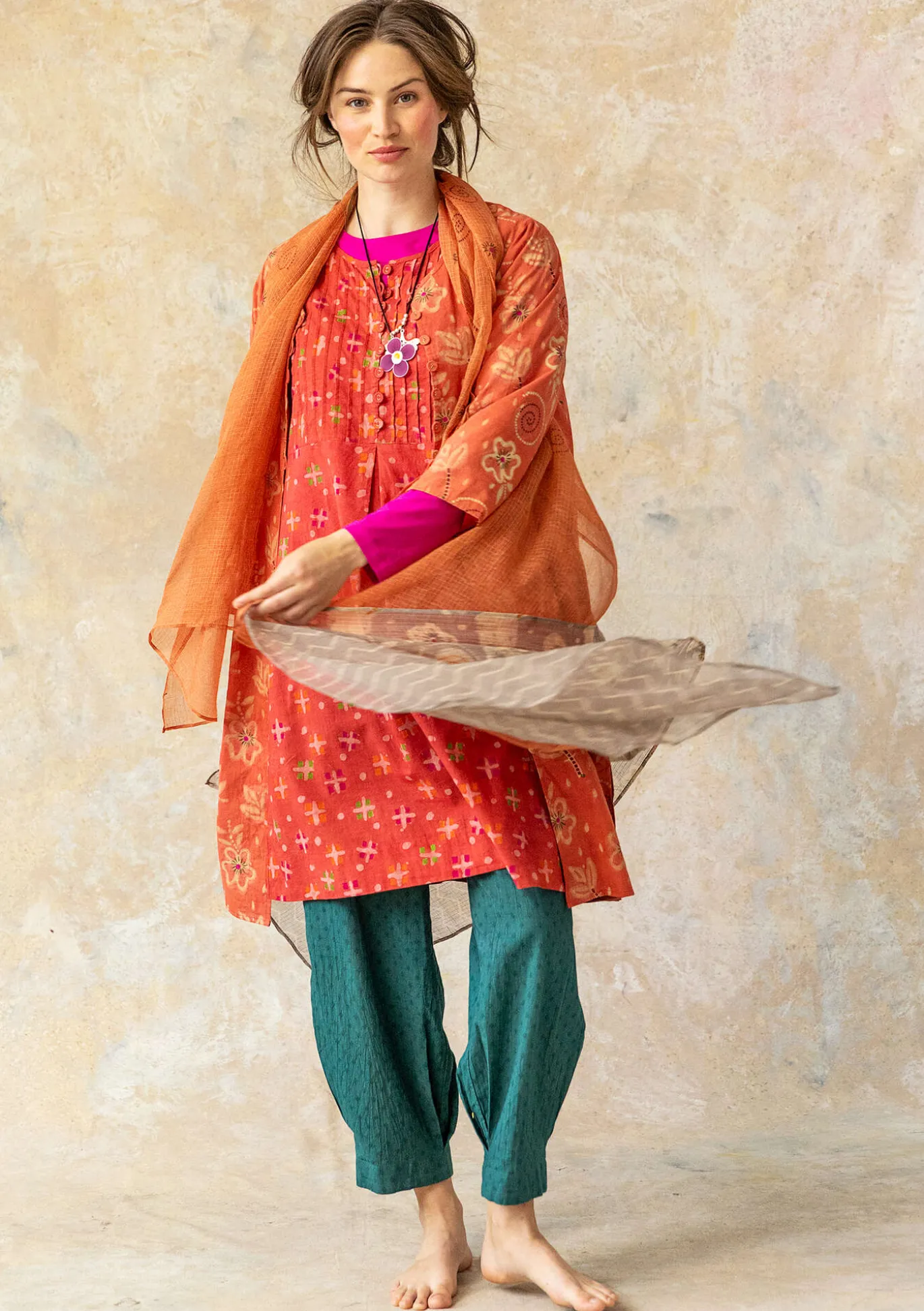 Tämän mekon kuvio on tehty laattapainannalla, estovärjäyksellä ja kasvivärjäyksellä. Pyöreä pääntie, kangaspäällysteiset napit ja pitkähköt 3/4-hihat. Leikkaus vyötäröllä ja vastalaskos sekä edessä hiuslaskokset. Helman päärmettä koristaa sisäpuolella toinen kuvio.