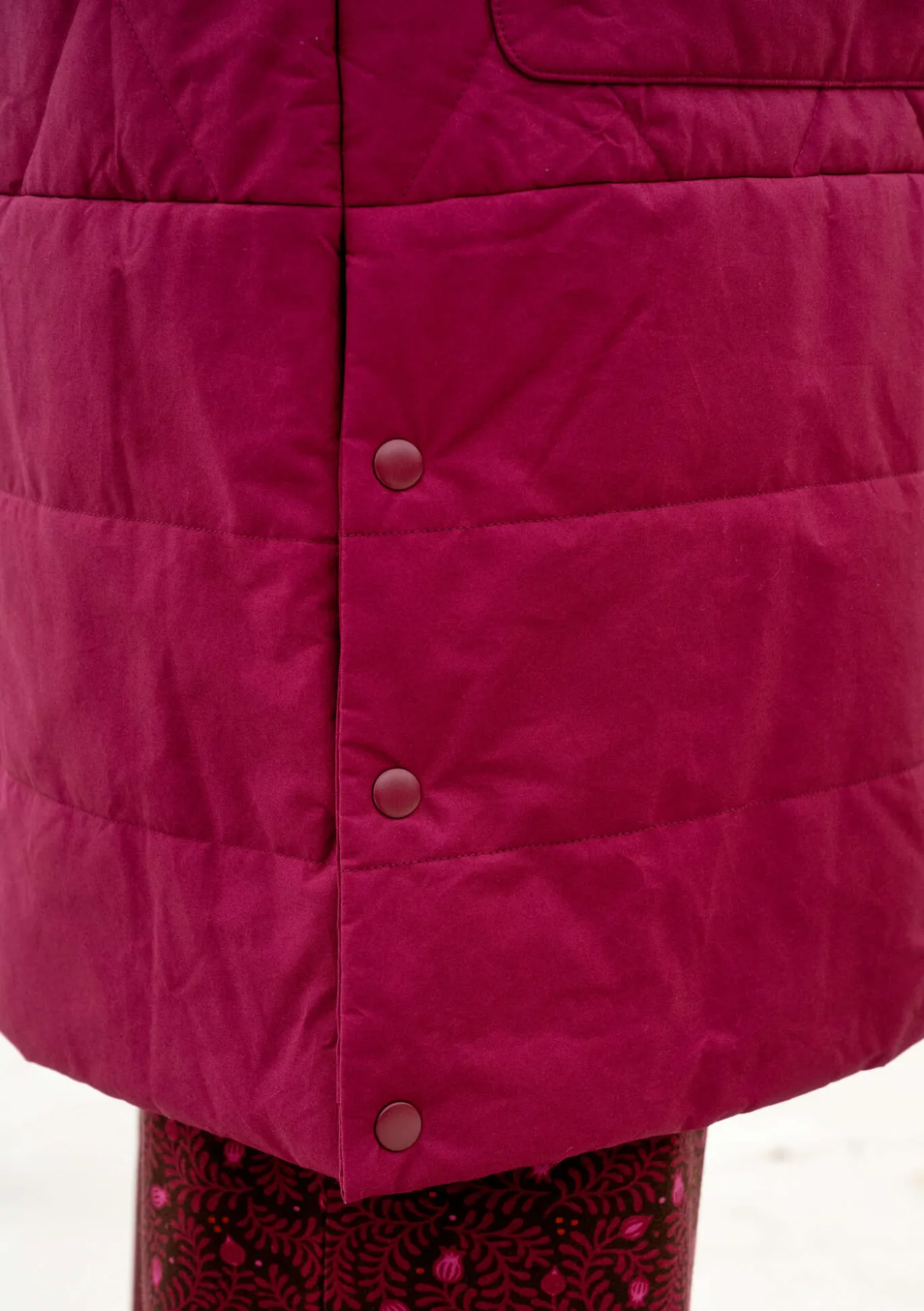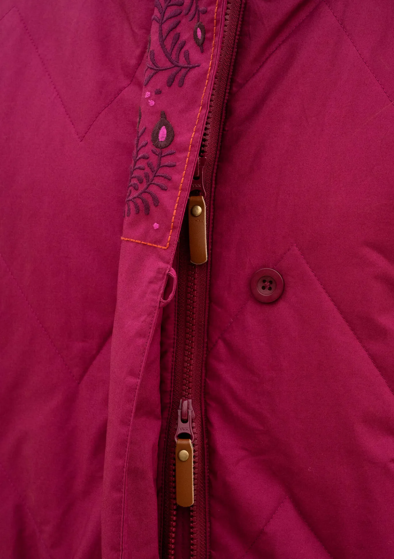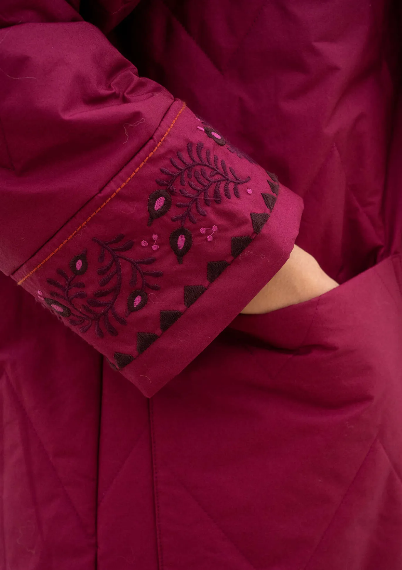 Tikatussa kokovuorillisessa takissa on kokopitkät hihat ja painonapeilla suljettavat sivuhalkiot. Edessä keskellä piilovetoketju ja nappilista. Reilunkokoiset taskut ja hihansuissa piiloresori. Pääntiessä, hihansuissa ja hupun reunassa koristeellisia kirjailuja.