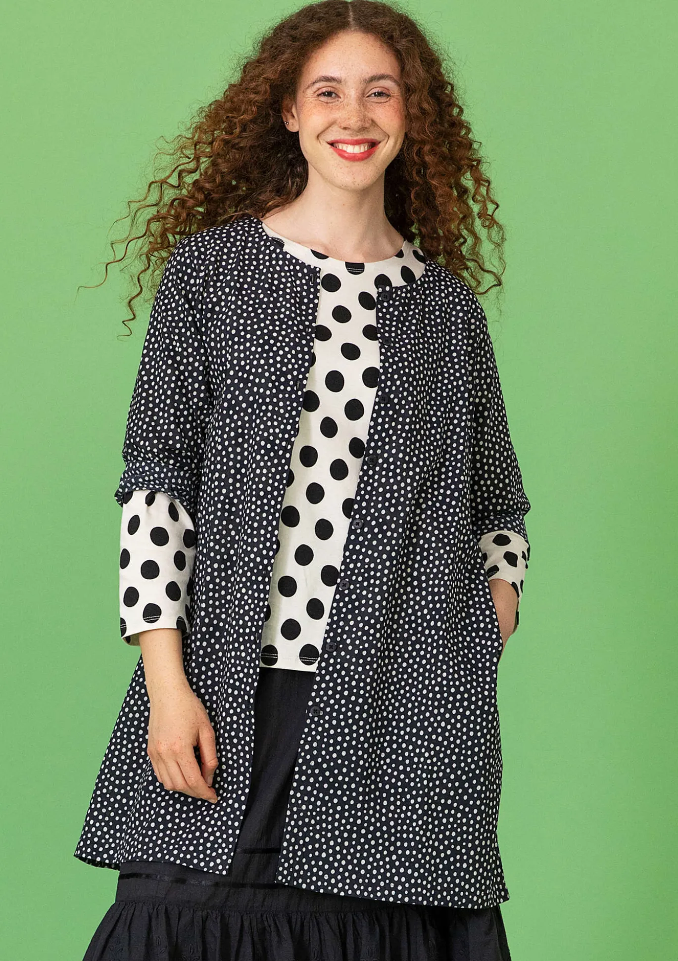 Alas asti napitettava tunika, jossa on painettu pilkkukuvio. Monikäyttöinen malli, jossa on pyöreä pääntie ja 3/4-pituiset hihat. Sivuissa piilotaskut.