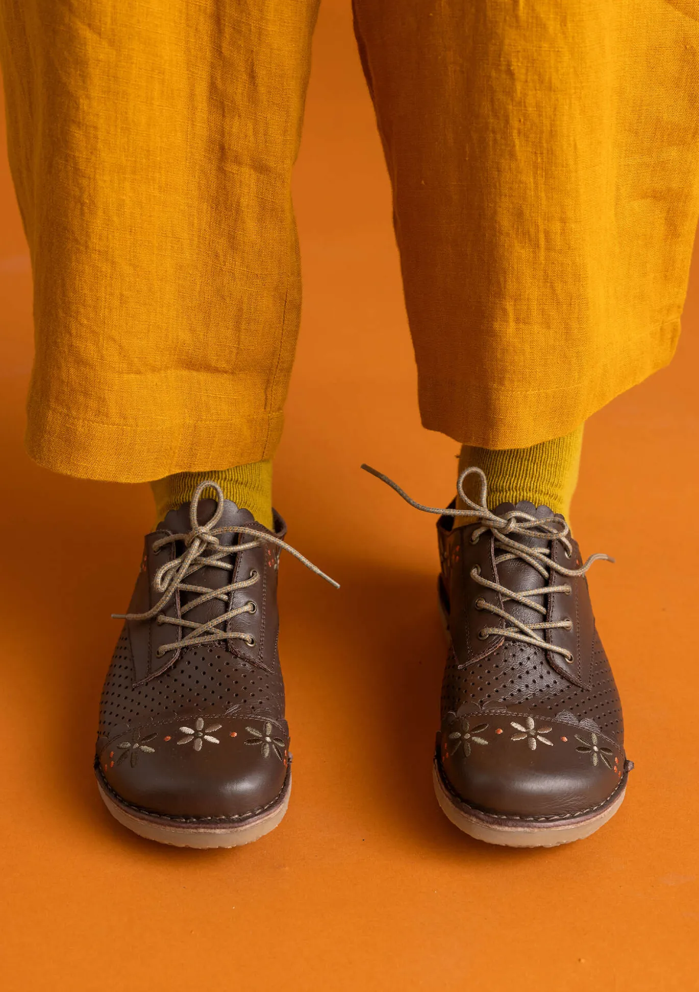 Kauniissa kävelykengissä on kukkakirjailuja ja aaltoreunat. Mukava malli, jossa on stanssattu reikäkuvio ja puolivuori.