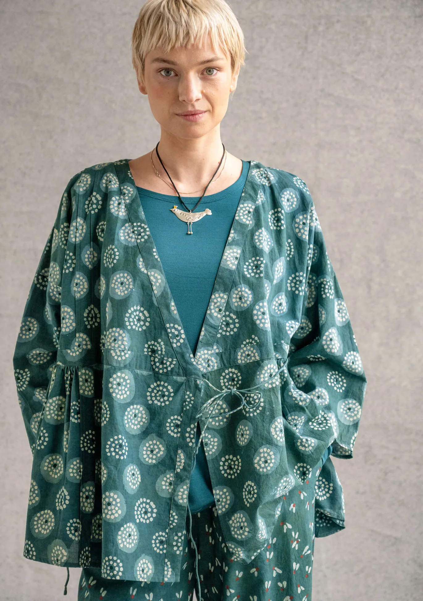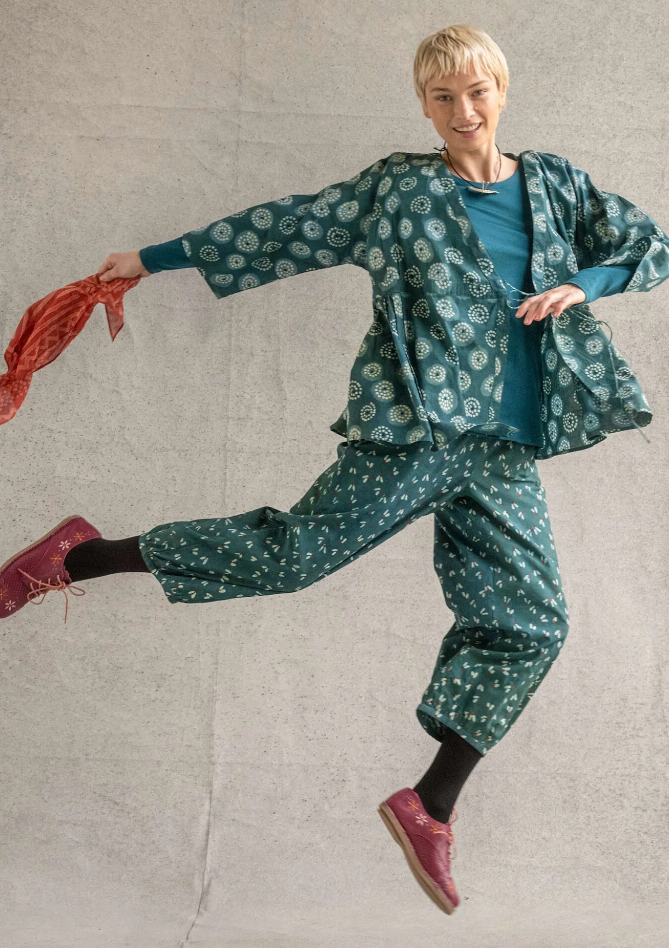 Kietaisupusero, jossa on 3/4-hihat, lasketut olkasaumat, nyörit sivussa ja sivutaskut. Tämä pusero edustaa käsityötaitoa hienoimmillaan: se on laattapainettu savella ja värjätty useilla kasvipigmenteillä. Huolellisesti viimeistelty: nyörin päihin on kierretty lankaa hienoksi yksityiskohdaksi.