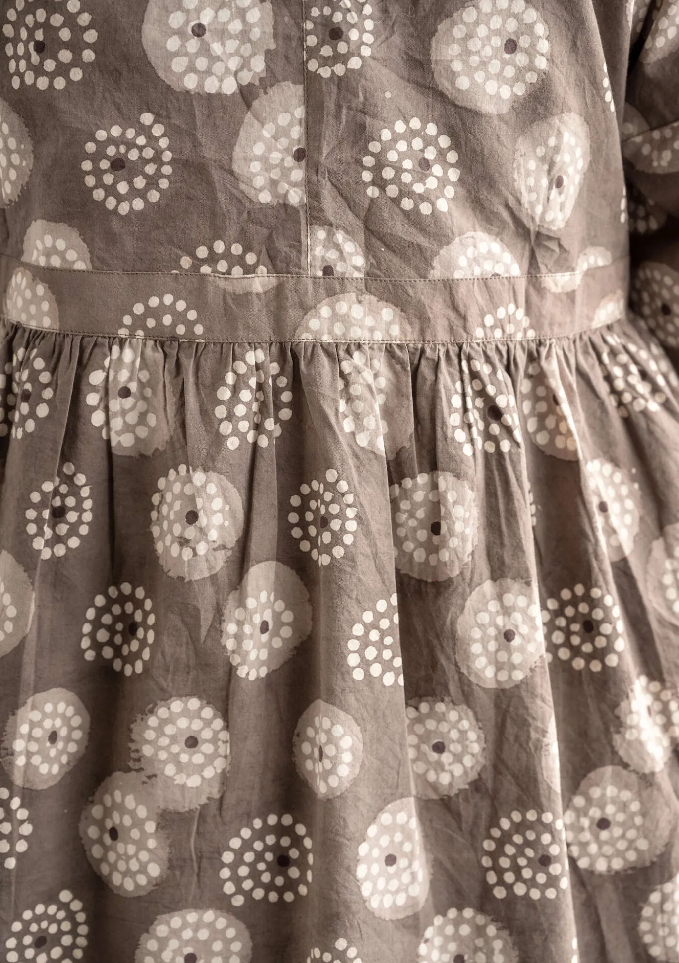 Kietaisupusero, jossa on 3/4-hihat, lasketut olkasaumat, nyörit sivussa ja sivutaskut. Tämä pusero edustaa käsityötaitoa hienoimmillaan: se on laattapainettu savella ja värjätty useilla kasvipigmenteillä. Huolellisesti viimeistelty: nyörin päihin on kierretty lankaa hienoksi yksityiskohdaksi.