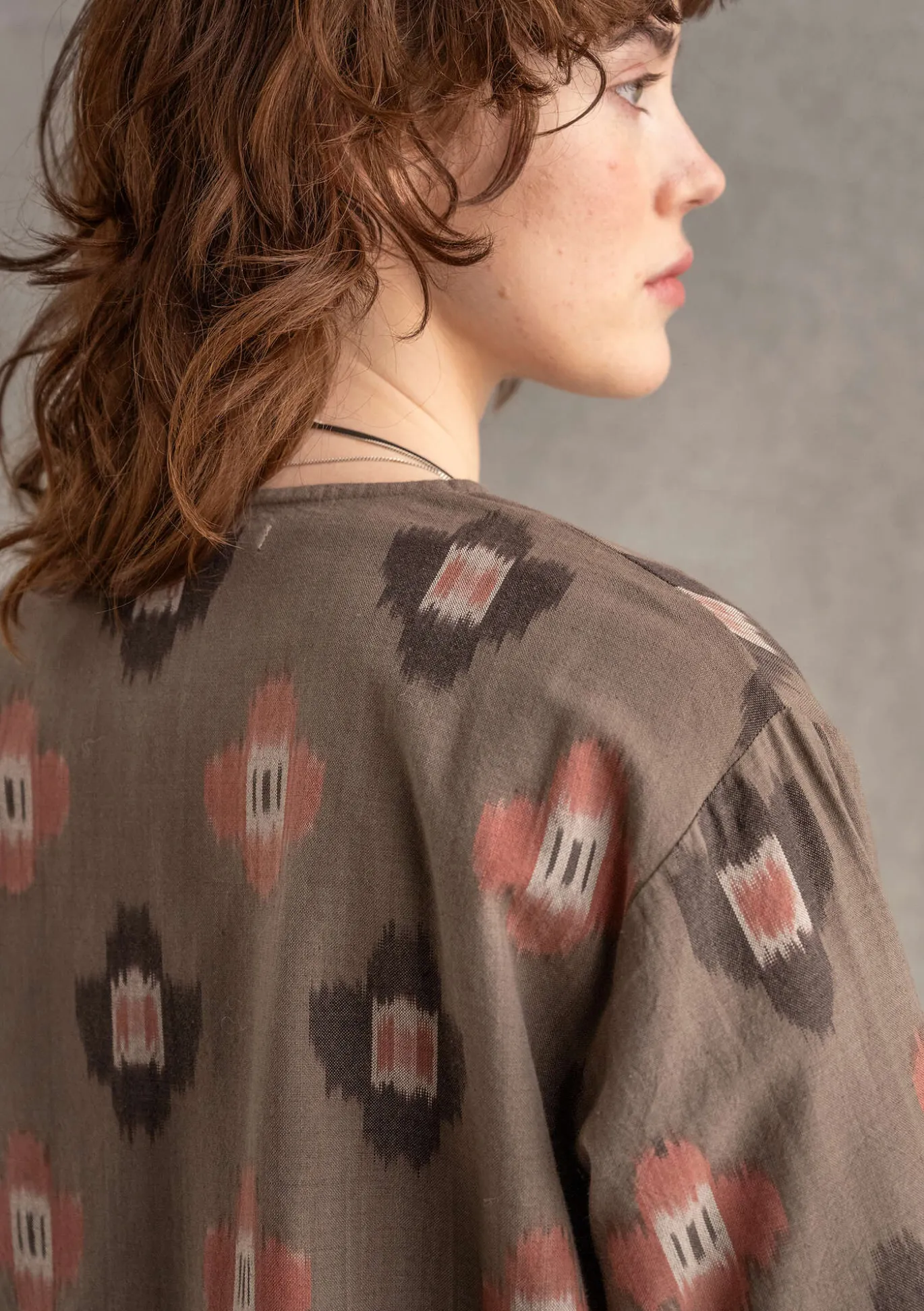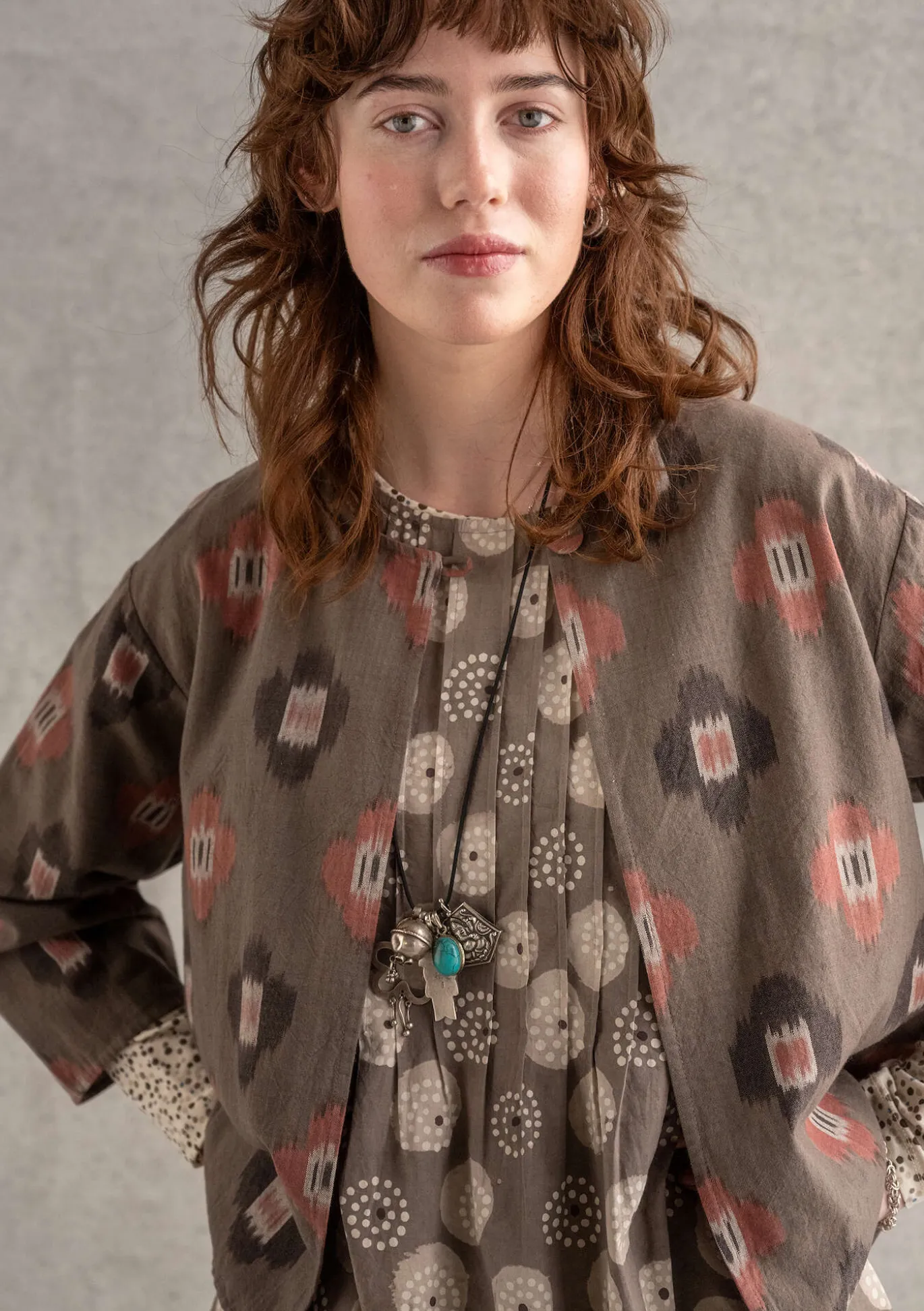 Ikat-kudottu takki, jossa on kukkakuvio. Hieman levenevä helma, pyöreä pääntie ja 3/4-hihat. Yksi pelkistetty tekstiilipäällysteinen nappi.