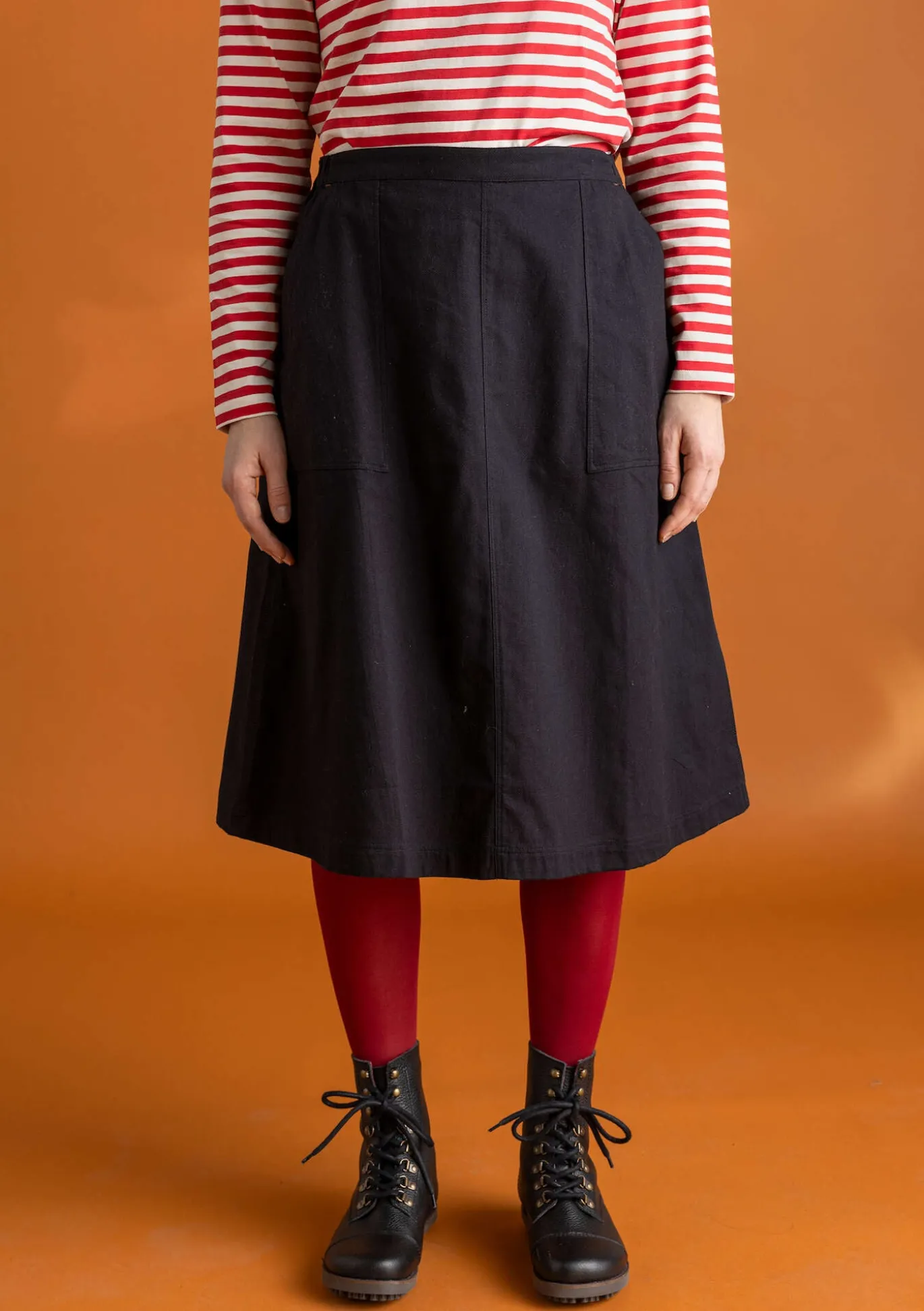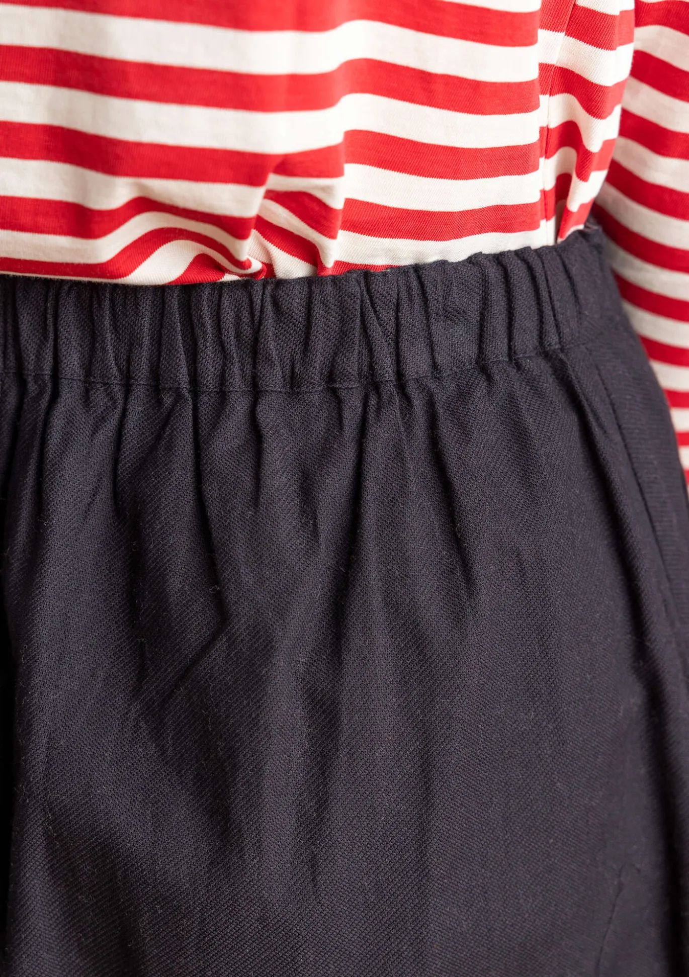 Kevyesti kellotettu helma ja kätevät taskut. Kauniita yksityiskohtia, kuten kolmoistikkauksia sivusaumoissa ja korostevärisiä bartack-ompeleita taskuissa. Takana mukava resori ja vyötärönauhan sisäpuolella somisteena pieni painokuvio.