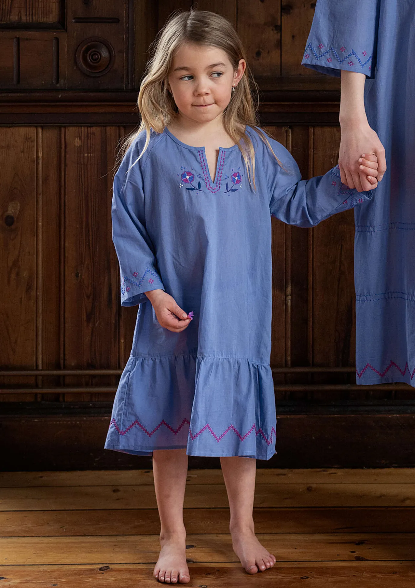 Yöpaita pienille gudrunistoille. Kevyttä kudottua puuvillakangasta, ja röyhelöhelma. Kirjailut hihansuissa, pääntien halkiossa ja helmassa.S: 98/104, M: 110/116, L: 122/128