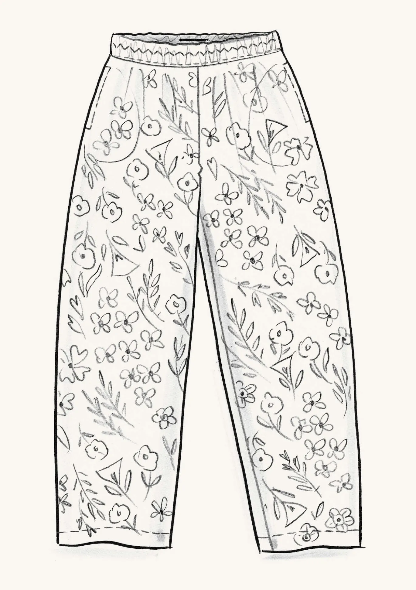 Nilkkapituinen malli, jossa on resori vyötäröllä ja sivutaskut.