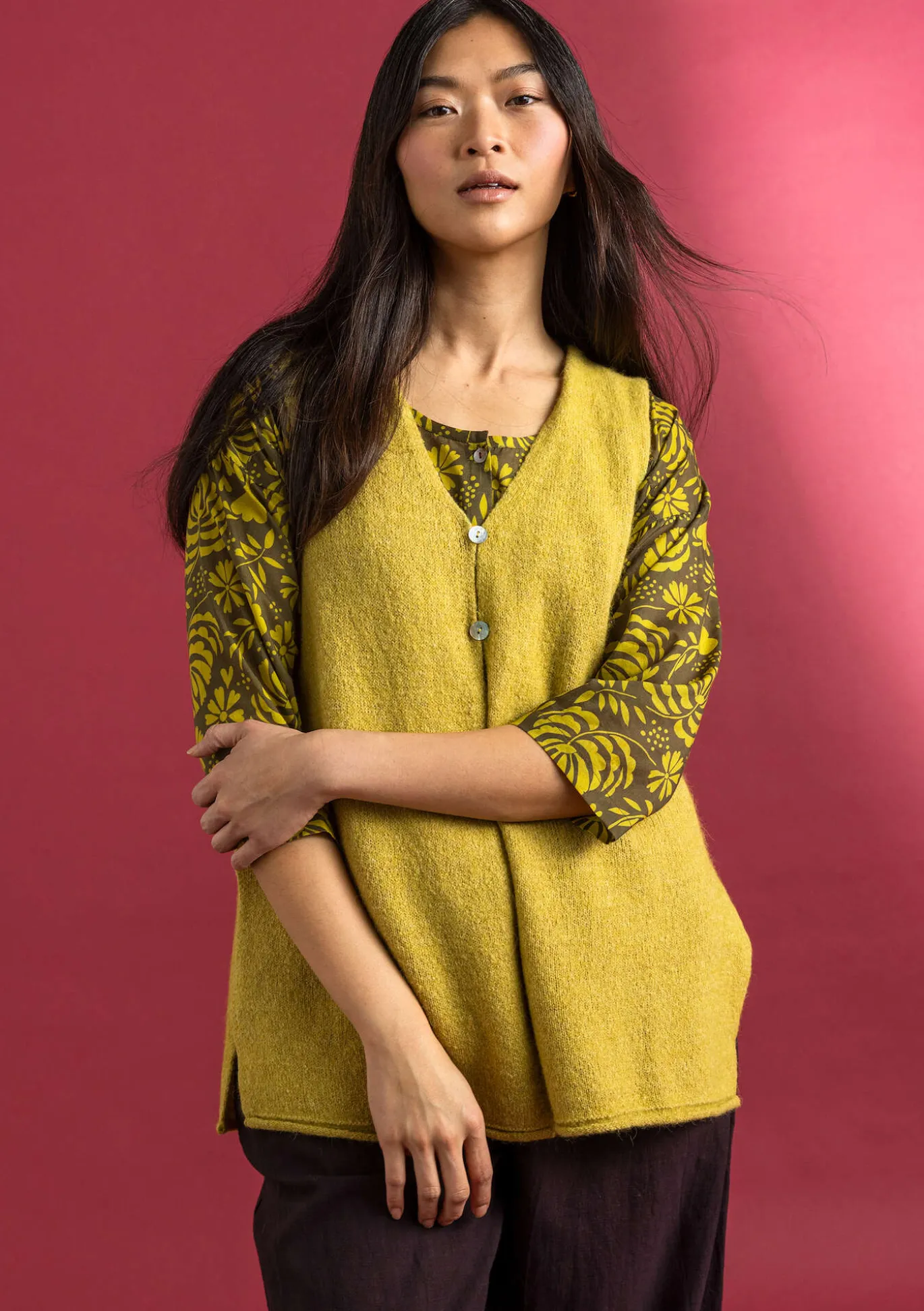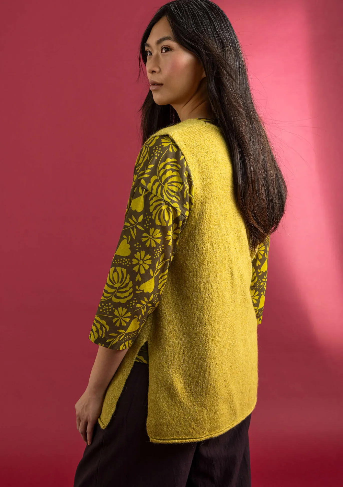 Pitkä neuleliivi. Neulottu pehmeästä ja hieman pörröisestä meleeratusta langastamme. Edessä helmiäisnapit ja virkatut nappilenkit ja sivuissa halkiot.