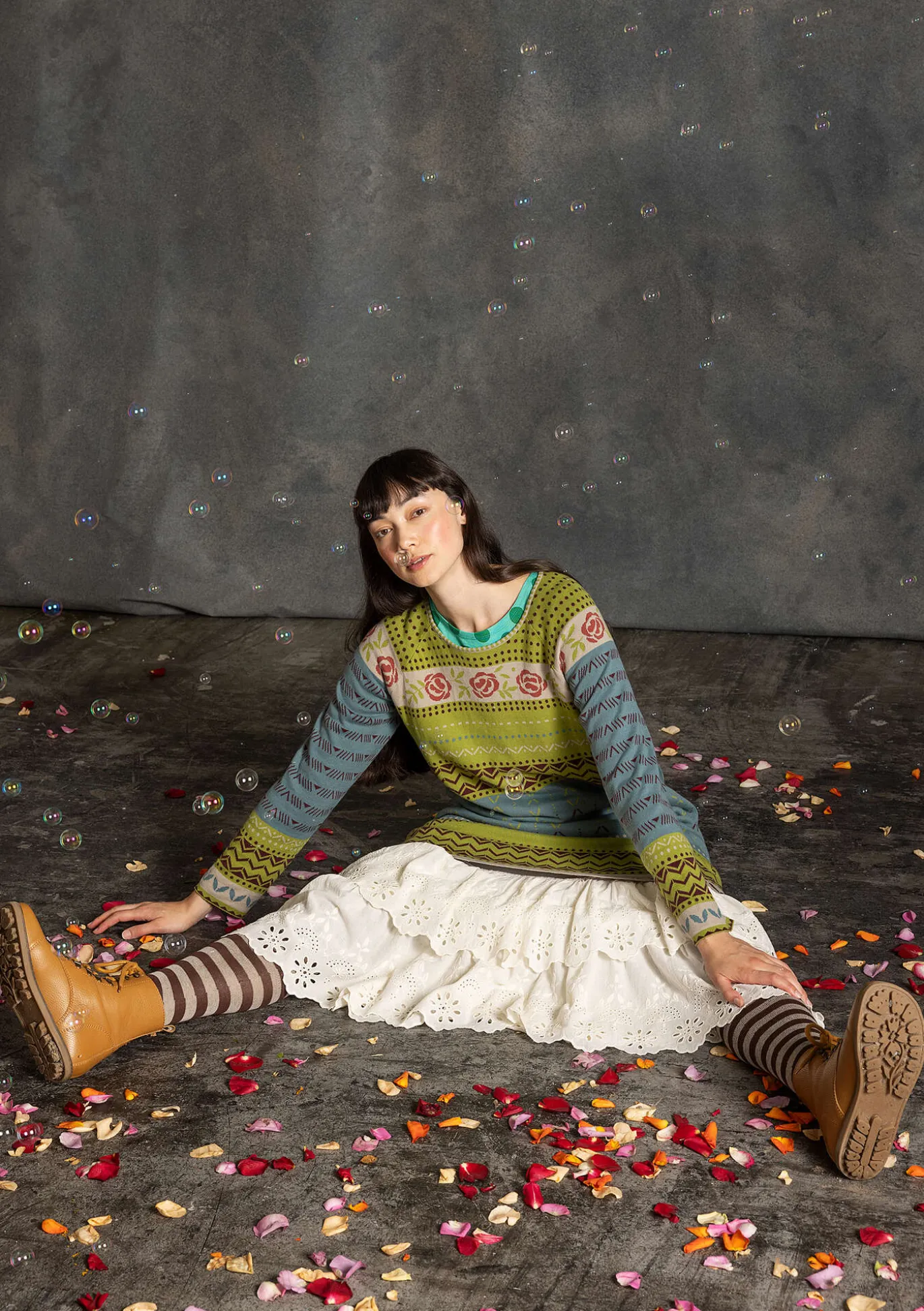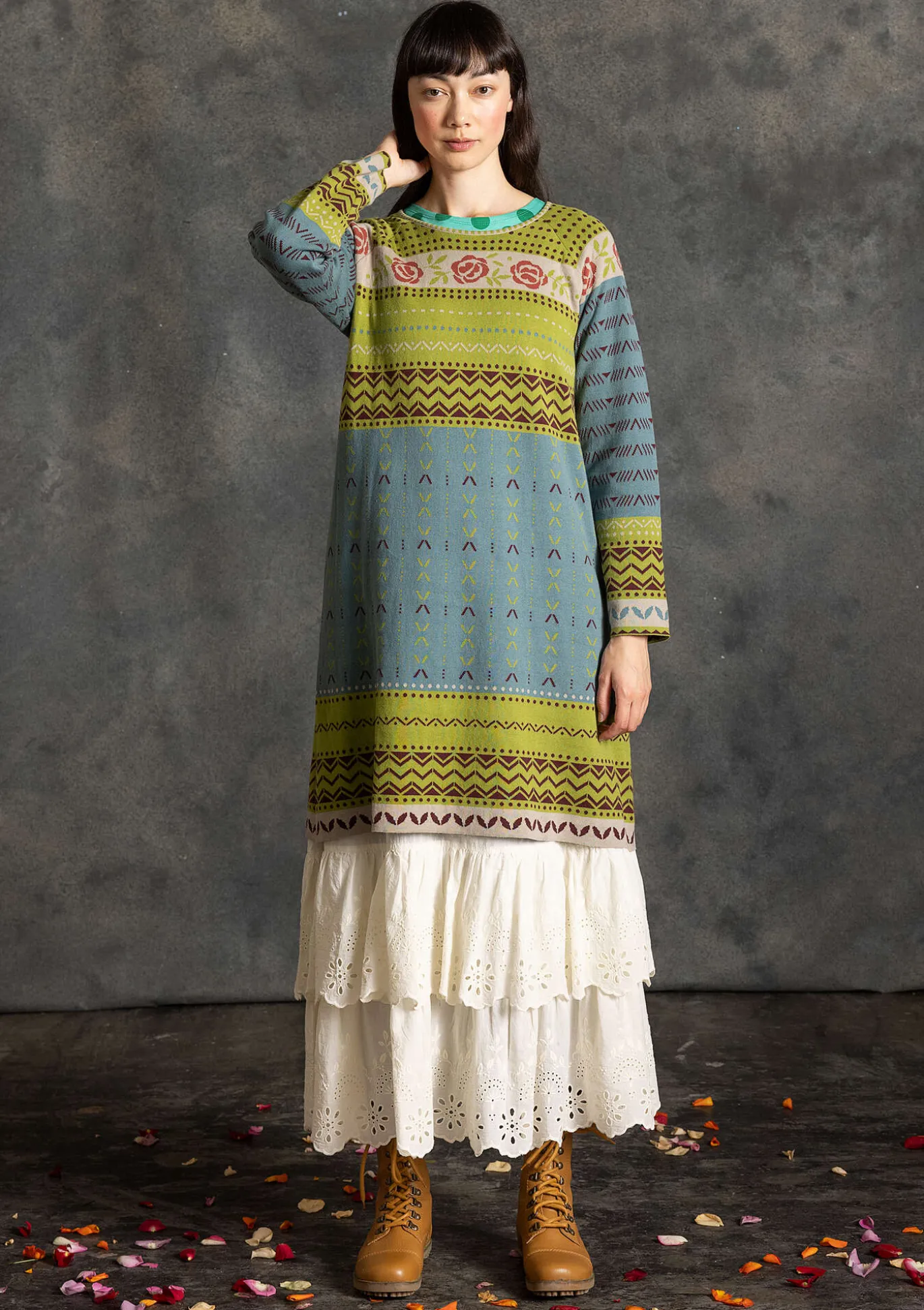 Jacquardneulemekko, jossa on täyspitkät hihat, pyöreä pääntie ja ihanan leveä helma. Kauniisti viimeistelty malli, jossa on aseteltu ruusukuvio pääntien reunassa ja olkaosiossa.