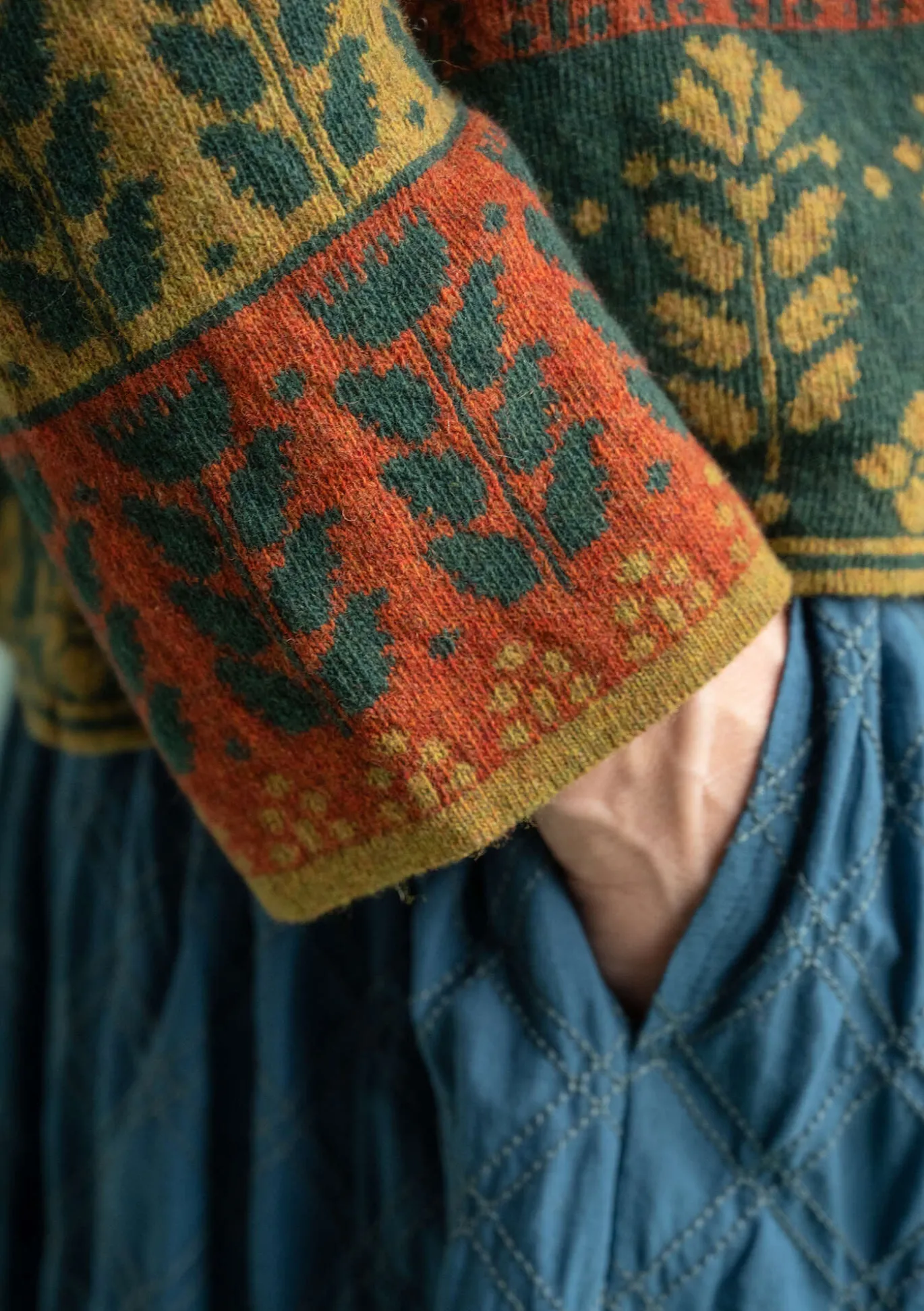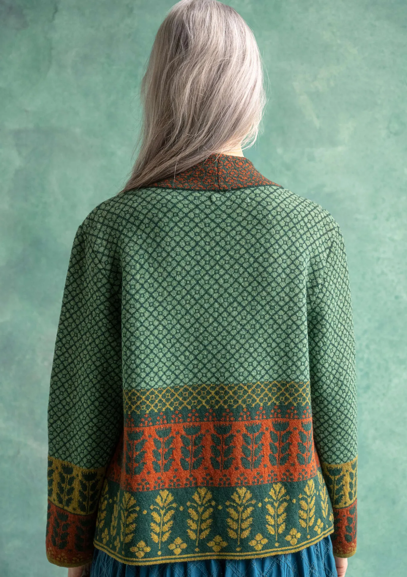 Jacquardneulottu kietaisuneuletakki, jossa on täyspitkät hihat. Kauniisti kuvioidut boordit. Koristeellinen helmiäisnappi ja virkattu lenkki napinläpenä.