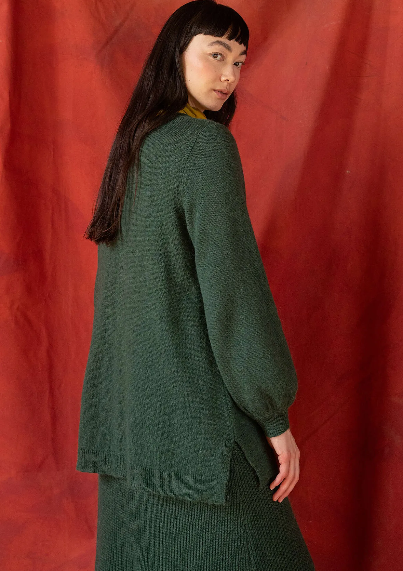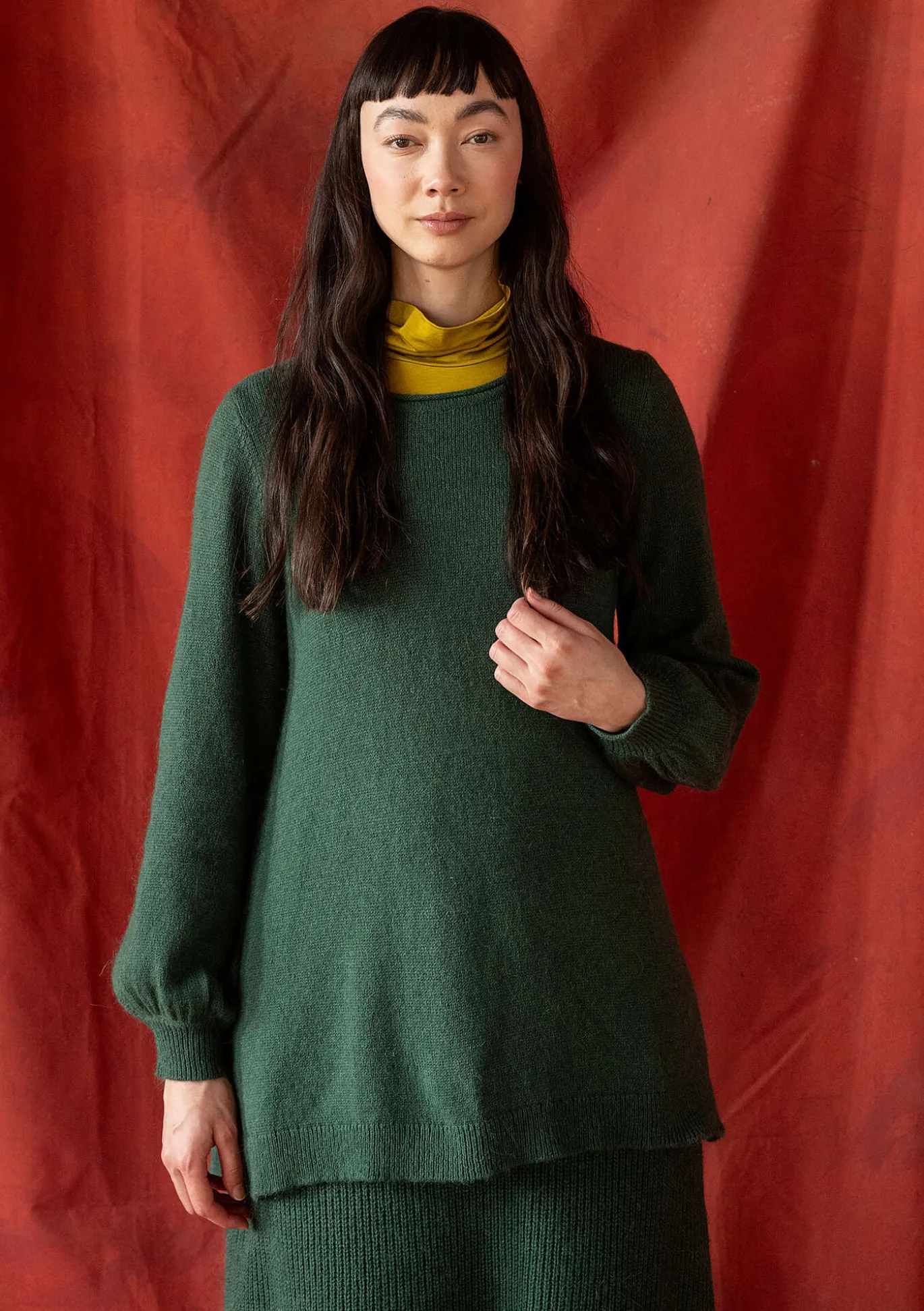 Sileäneulostukina pehmeää alpakkasekoitetta. Sivuhalkiot. Pitkät suistaan pussilla olevat hihat ja pyöreä pääntie, jossa on rullareunus. Ribbineulotut hihansuut ja helma.