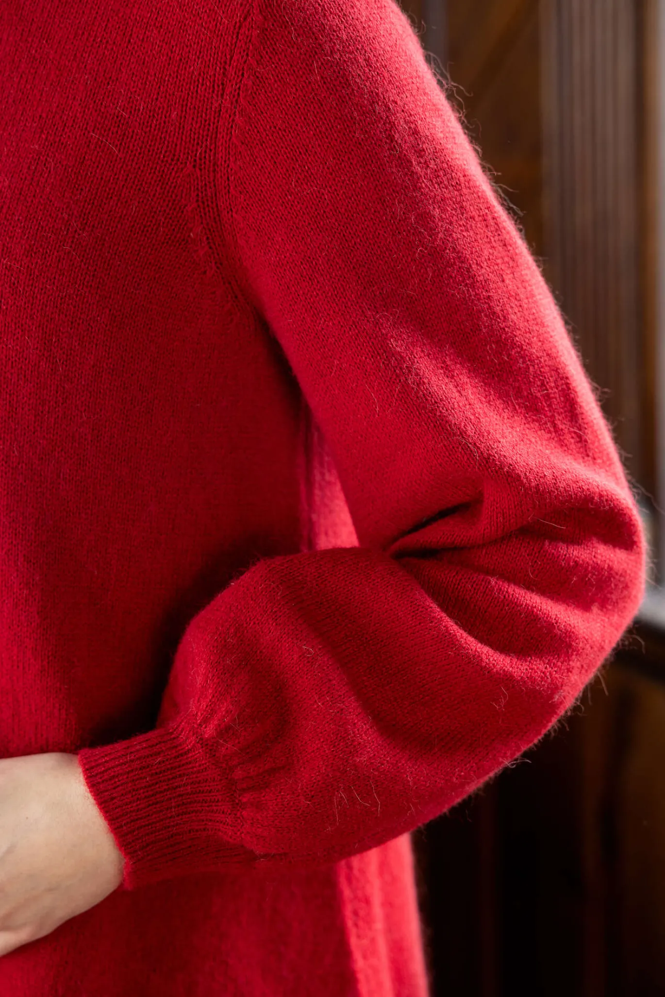 Sileäneulostukina pehmeää alpakkasekoitetta. Sivuhalkiot. Pitkät suistaan pussilla olevat hihat ja pyöreä pääntie, jossa on rullareunus. Ribbineulotut hihansuut ja helma.