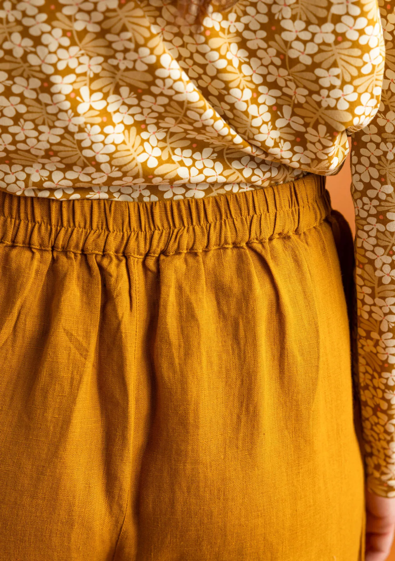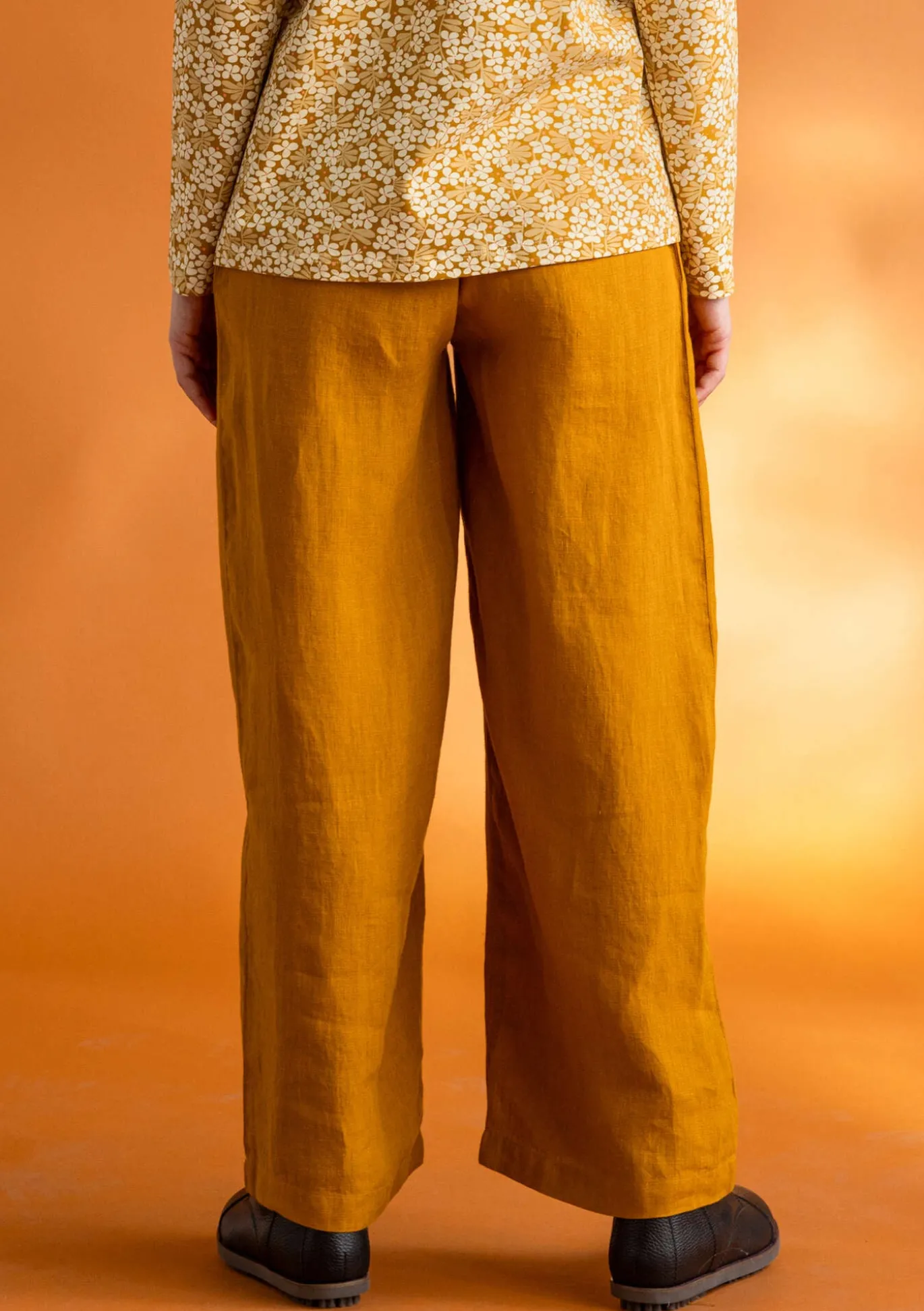 Materiaali on kauniisti laskeutuvaa pellavakangasta. Valittavana on yksivärisiä sekä lankavärjätty raitakuosi. Täyspitkät lahkeet ja vyötäröllä yksinkertainen resori. Suorat, väljät lahkeet ja sivuissa käytännölliset taskut.