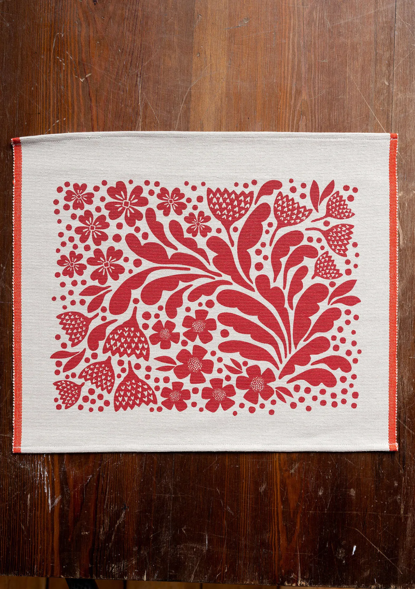 Pöytätabletti tiheään kudottua ripsisidoksista kangasta, jota koristaa rehevä kukkapainatus. Kauniit kontrastivärisiksi kudotut reunat.