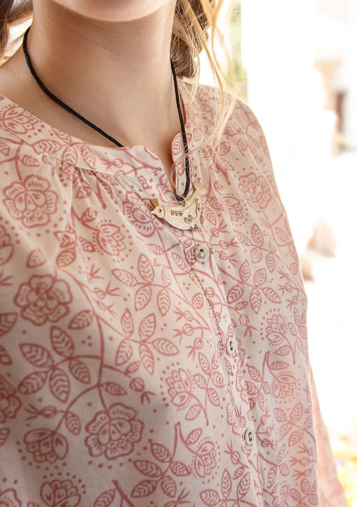 Puseroa somistaa laattapainettu herkkäilmeinen orjanruusukuvio. Pyöristetty helma ja miehustassa nappilista, joka päättyy alaosastaan lisäväljyyttä antavaan vastalaskokseen. Vaarinkaulus, päällystetyt napit ja takakappaleessa kaarroke. Täyspitkät pussihihat ja olkasaumassa terereuna.