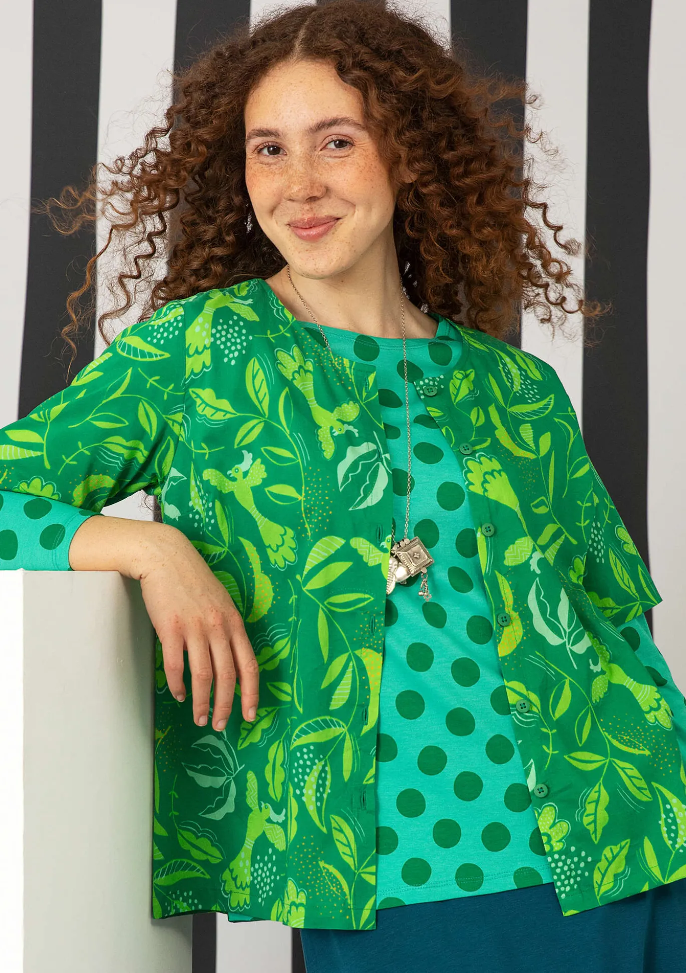 Ihastuttava pusero, jota koristavat linnut ja lehdet. Alas asti napitettava malli, jossa on lyhyet hihat ja pyöreä pääntie.