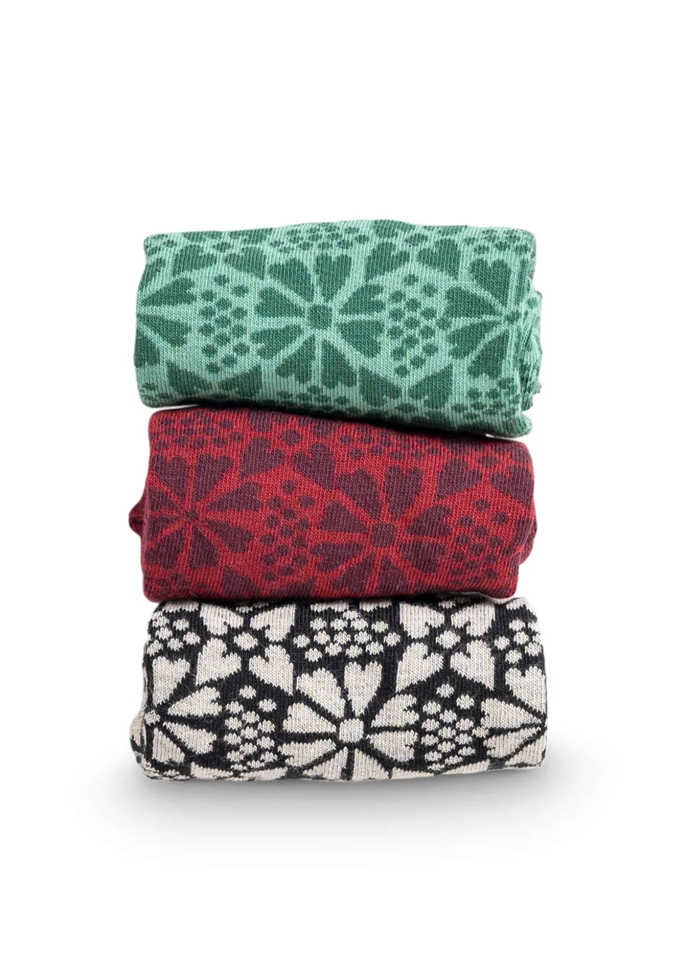 Tätä pikku sukkaa somistaa graafinen folklorehenkinen kukkakuvio. Varrensuussa pehmeä ribbireunus.