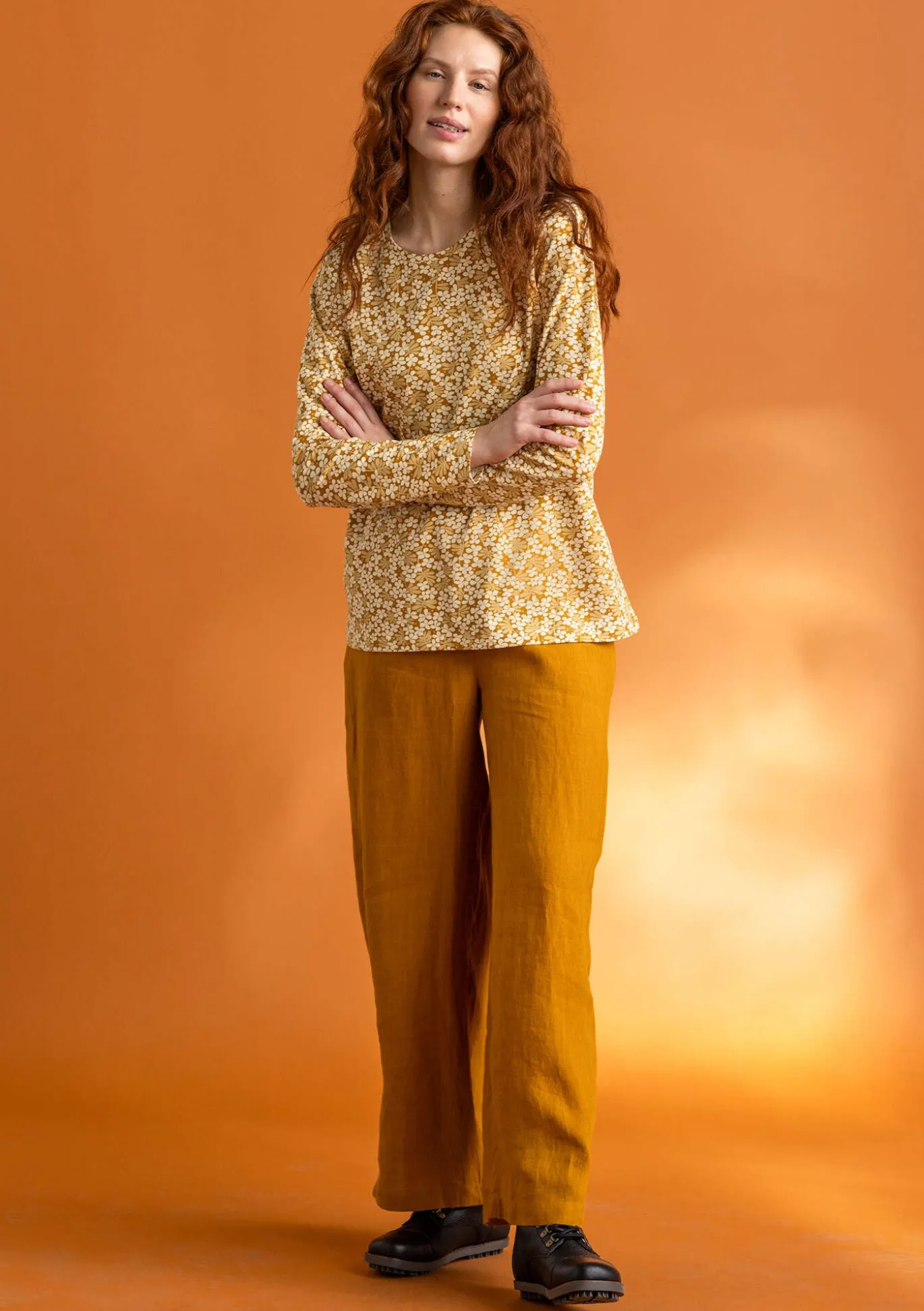 Monikäyttöinen malli, pyöreä pääntie ja täyspitkät hihat. Saatavana on sekä yksivärisiä että pienellä painetulla ”Ylva”-kukkakuviolla somistettuja vaihtoehtoja.