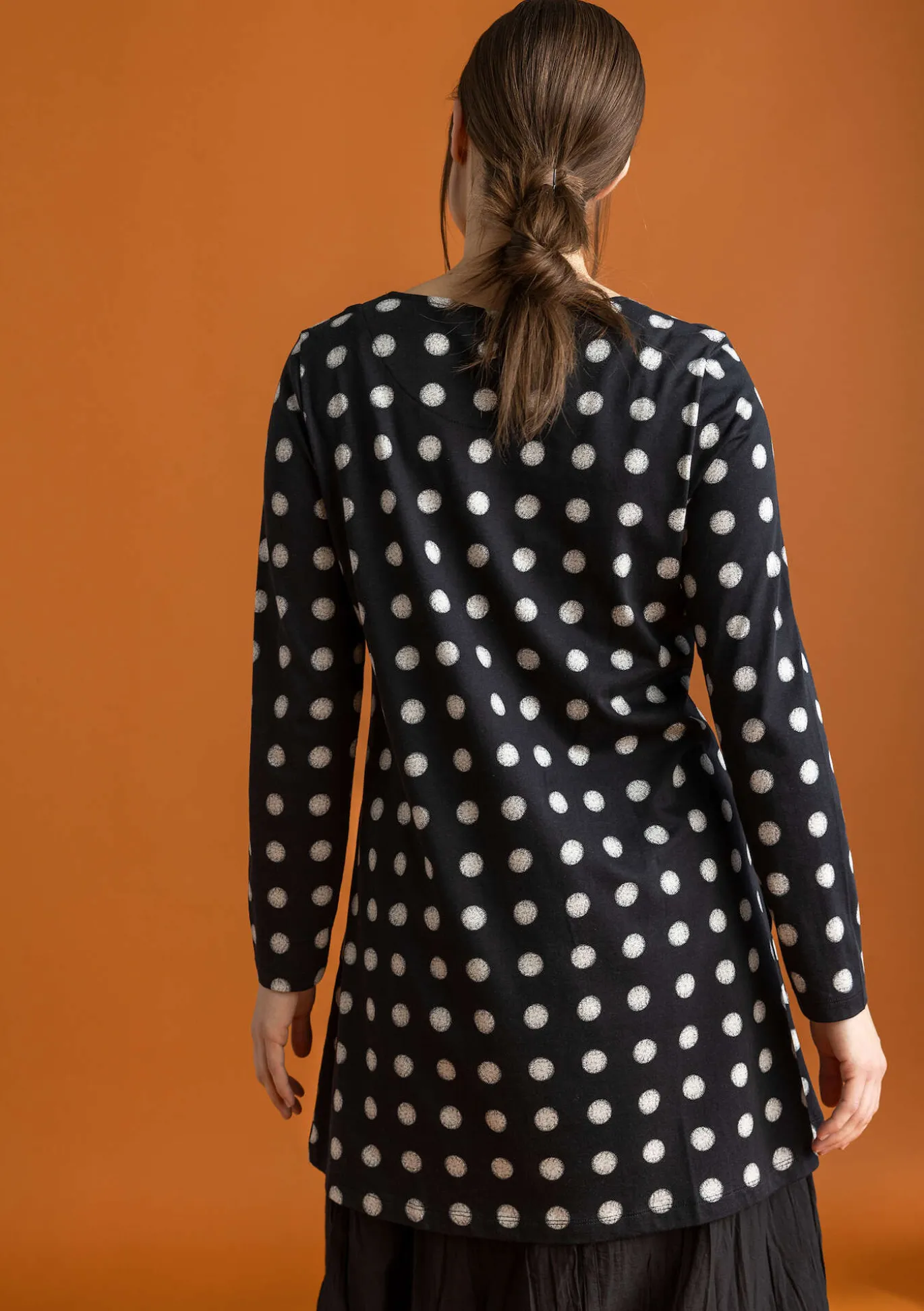 Pelkistetty malli, pyöreä pääntie ja sivutaskut. Täyspitkät hihat. Valittavana on sekä yksivärisiä että painetulla pilkkuaiheisella ”Tyra”-kuviolla somistettuja versioita. Kevyesti alaspäin levenevä helma.