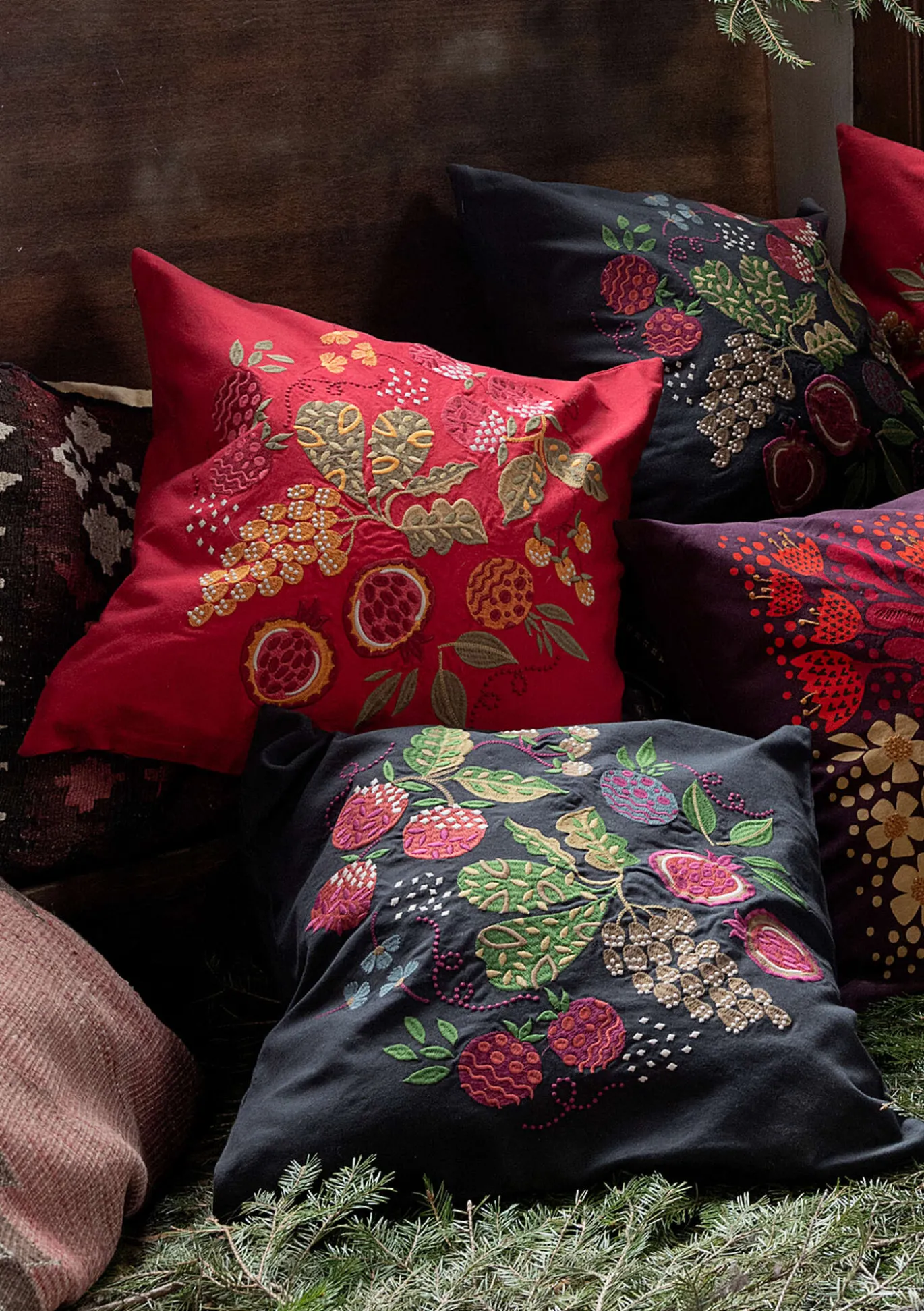 Ihastuttava tyynynpäällinen, jossa on kirjailtu, kandeerattuja hedelmiä ja reheviä lehtiä esittävä kuvio. Piilovetoketju alaosassa.