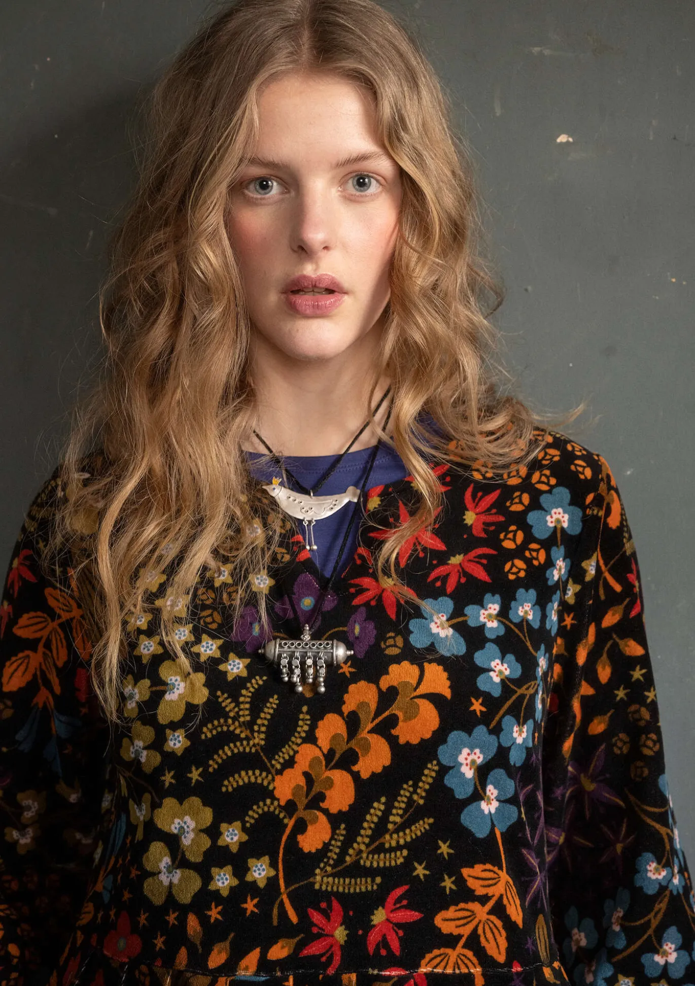 Painokuvioitu veluurimekko, leikkaus vyötäröllä ja laskokset hameosassa. Hieman pussimaiset 3/4-hihat, sivutaskut ja pyöreä pääntie, jossa on lyhyt halkio edessä. Kaksi kahdella värillä painettua värivaihtoehtoa ja kolmas monivärinen, jonka pääntie on koristeltu kullanvärisellä langalla tehdyillä pistoilla.