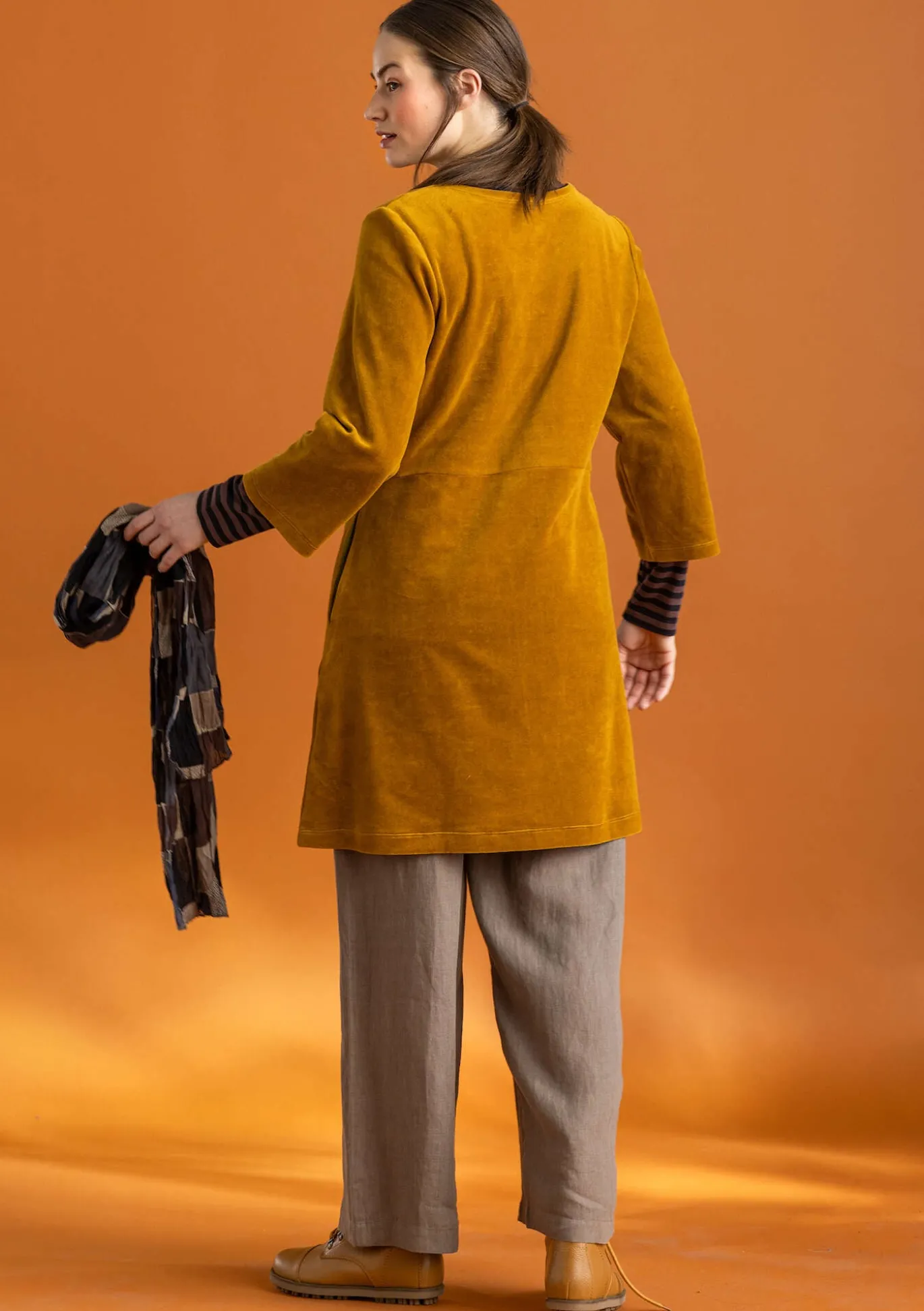 Monikäyttöinen malli ihanaa veluuria. Siro yläosa ja hieman väljempi helma. Puolipitkät hihat ja sivuissa piilotaskut.