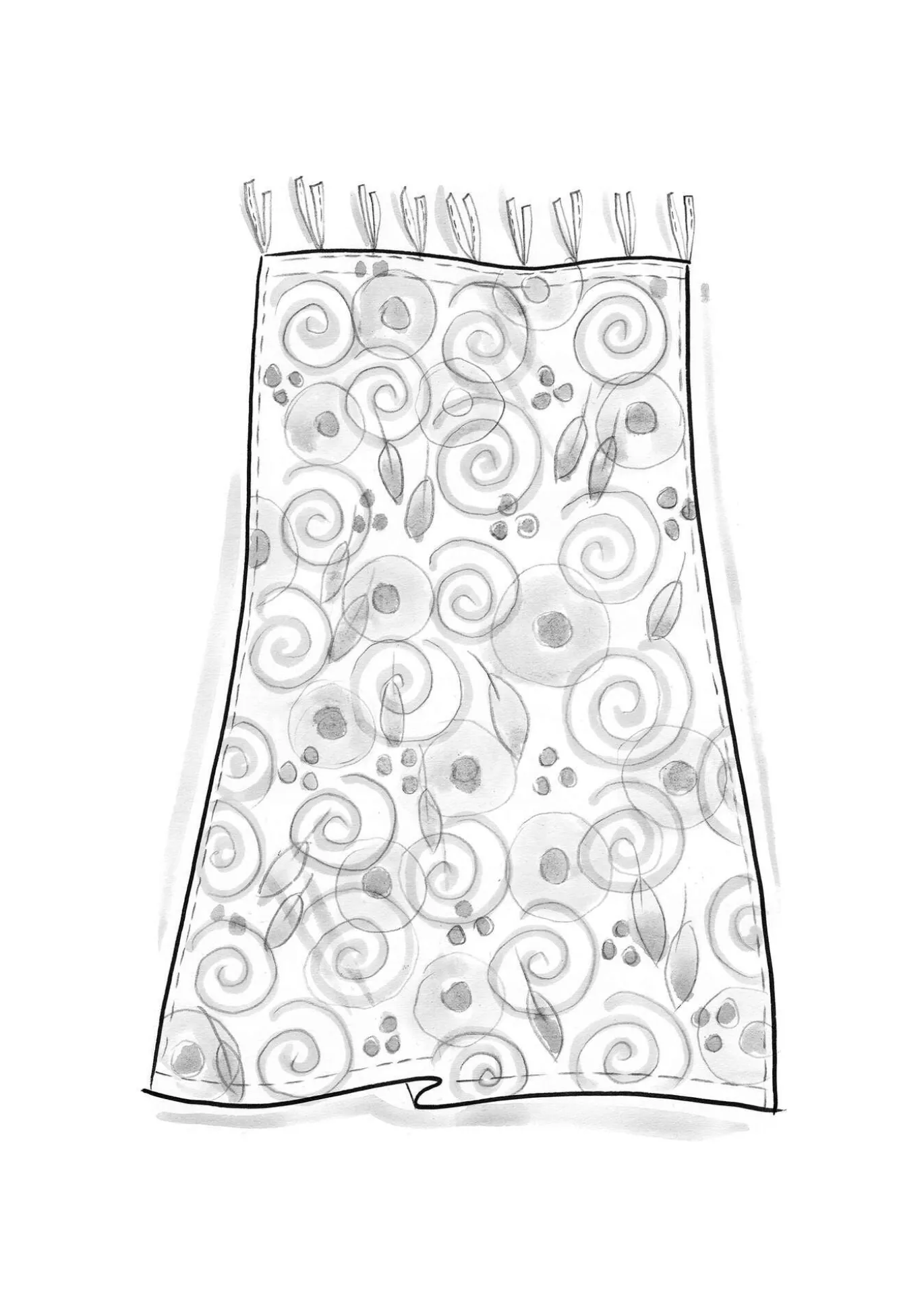 Läpikuultavasta ekopuuvillasta tehty verho, jossa on digipainettu aseteltu kuvio ja yläreunassa samasta kankaasta tehdyt solmintanauhat. Myydään kappaleittain.