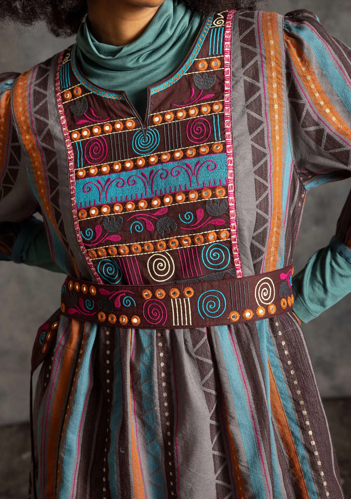 Koristeellinen vyö, jossa on kirjailuja ja peilikirjailuja. Vuori painokuvioitua pilkullista kangasta. Nauhat solmimiseen, päissä koristeelliset langat.