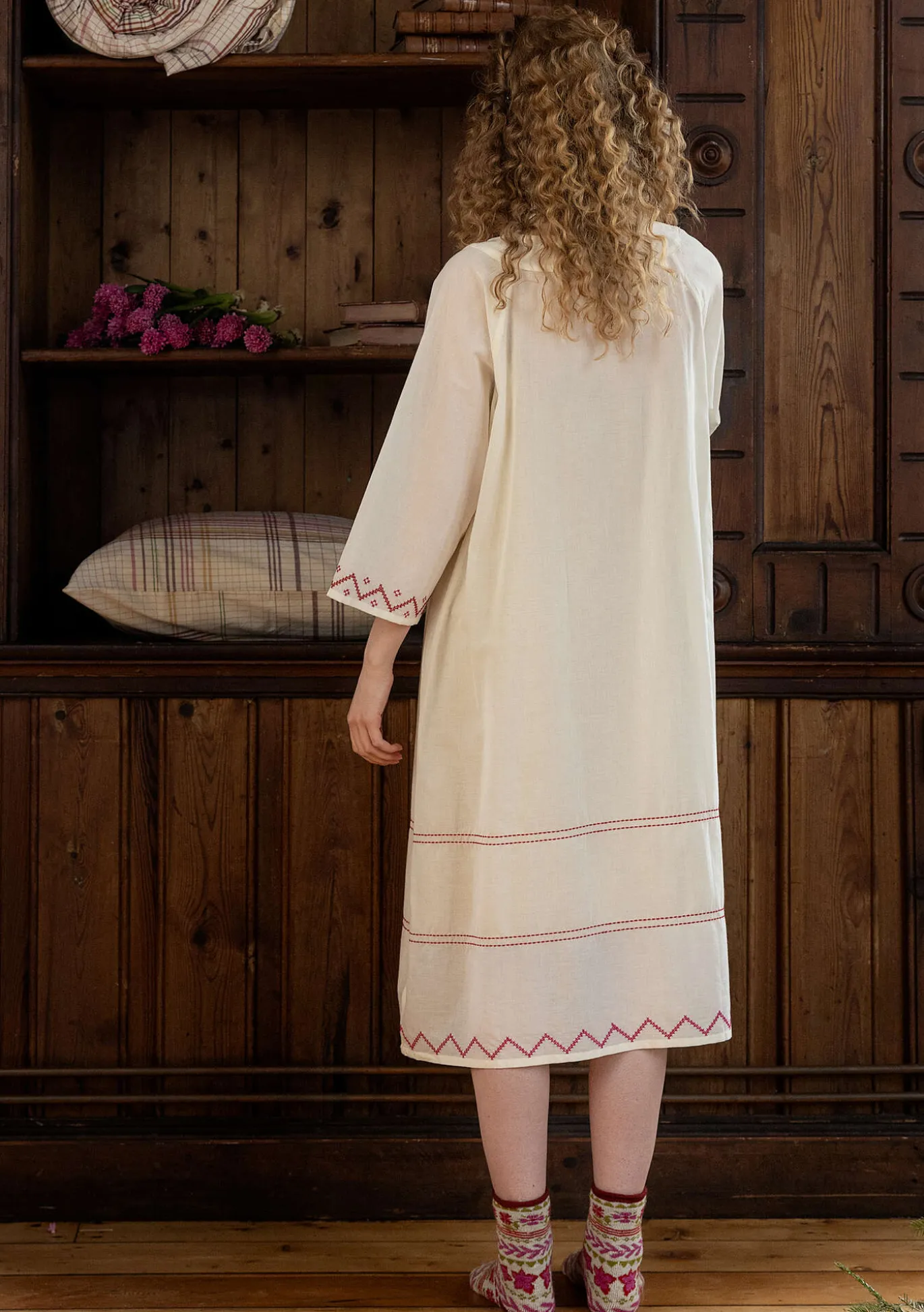 Kudotusta kankaasta tehty yöpaita, jossa on 3/4-hihat ja runsaasti koristeltu miehusta. Pyöreä pääntie, jossa on pieni halkio ja solmintanauhat keskellä edessä. Kirjailut hihansuissa ja helmassa.