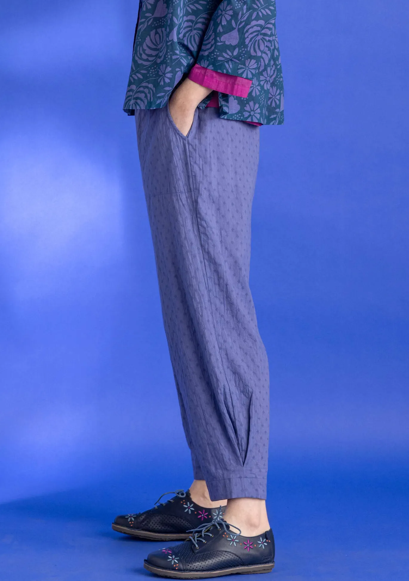 Nilkkapituinen malli. Materiaali on dobby-kudosta, joka luo yksiväriseen vaatteeseen eläväpintaista struktuuria. Lahkeensuissa kevyttä pussimaista muotoa antavat vastalaskokset. Sivuissa taskut ja vyötäröllä mukava resori.