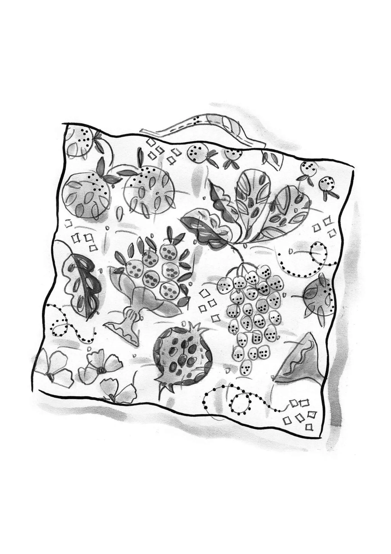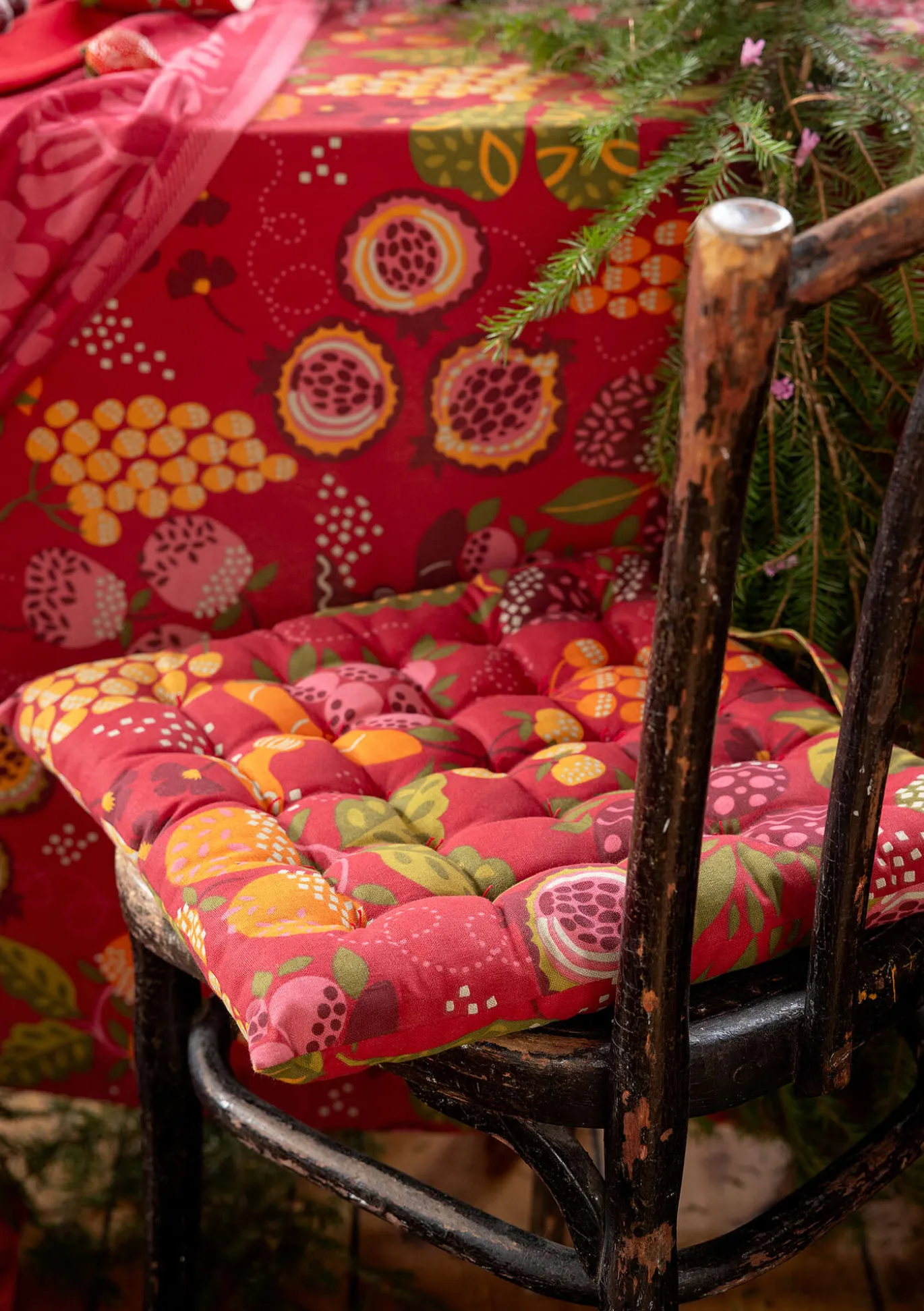 Istu mukavasti istuintyynyllä, jossa on värikäs painettu hedelmäkuvio. Neliön muotoinen malli, jossa on täyte ja tikkaus sekä ripustuskahva.