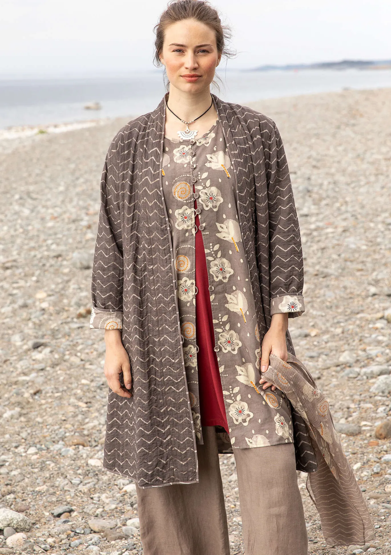 Tämä kääntötakki on todellinen käsityöaarre. Kuvioinnissa on käytetty laattapainantaa, estovärjäystä, kasvivärjäystä ja tikkauksia. Vaatteessa on saalikaulus, kangaspäällysteiset napit ja taskut edessä. Täyspitkät hihat.