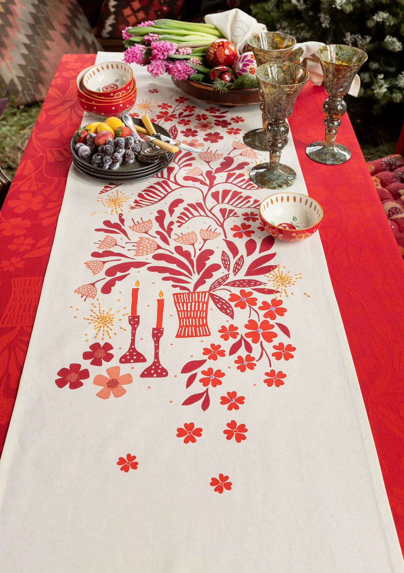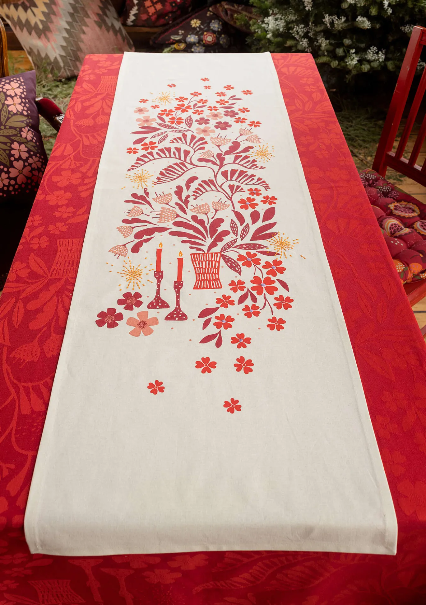 Ihastuttava kaitaliina, jossa on rehevä kukista ja kynttilänjaloista koostuva painokuvio ja kimaltavia kirjailtuja yksityiskohtia. Sopii sekä paljaalle pöydälle että pöytäliinan päälle.
