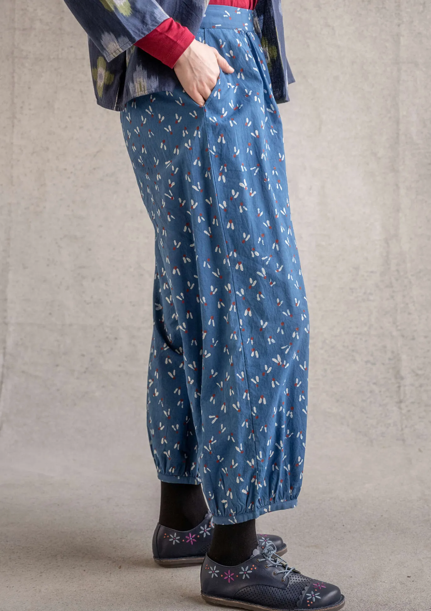 Pienikuvioiset pussihousut, jotka on laattapainettu savella ja kastettu värialtaisiin, joissa on eri kasvipigmenttejä. Vyötäröllä ommeltu resori ja sivuissa käytännölliset taskut.