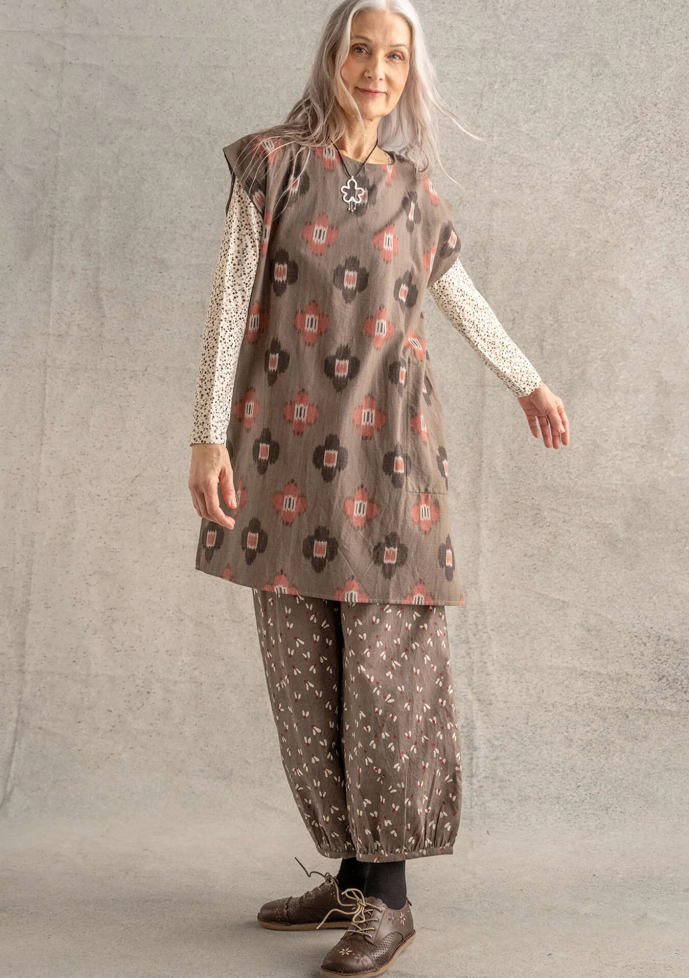 Pienikuvioiset pussihousut, jotka on laattapainettu savella ja kastettu värialtaisiin, joissa on eri kasvipigmenttejä. Vyötäröllä ommeltu resori ja sivuissa käytännölliset taskut.