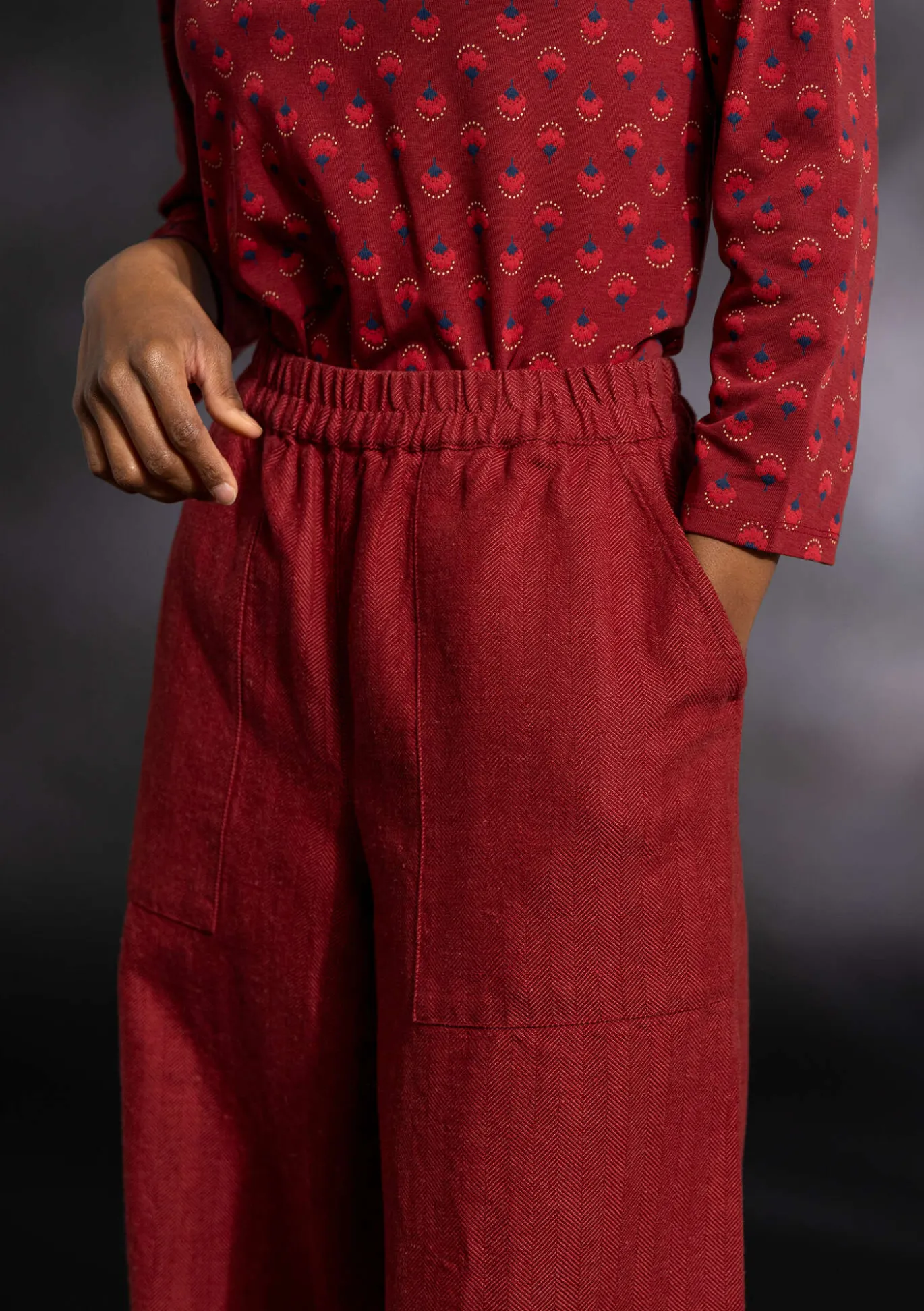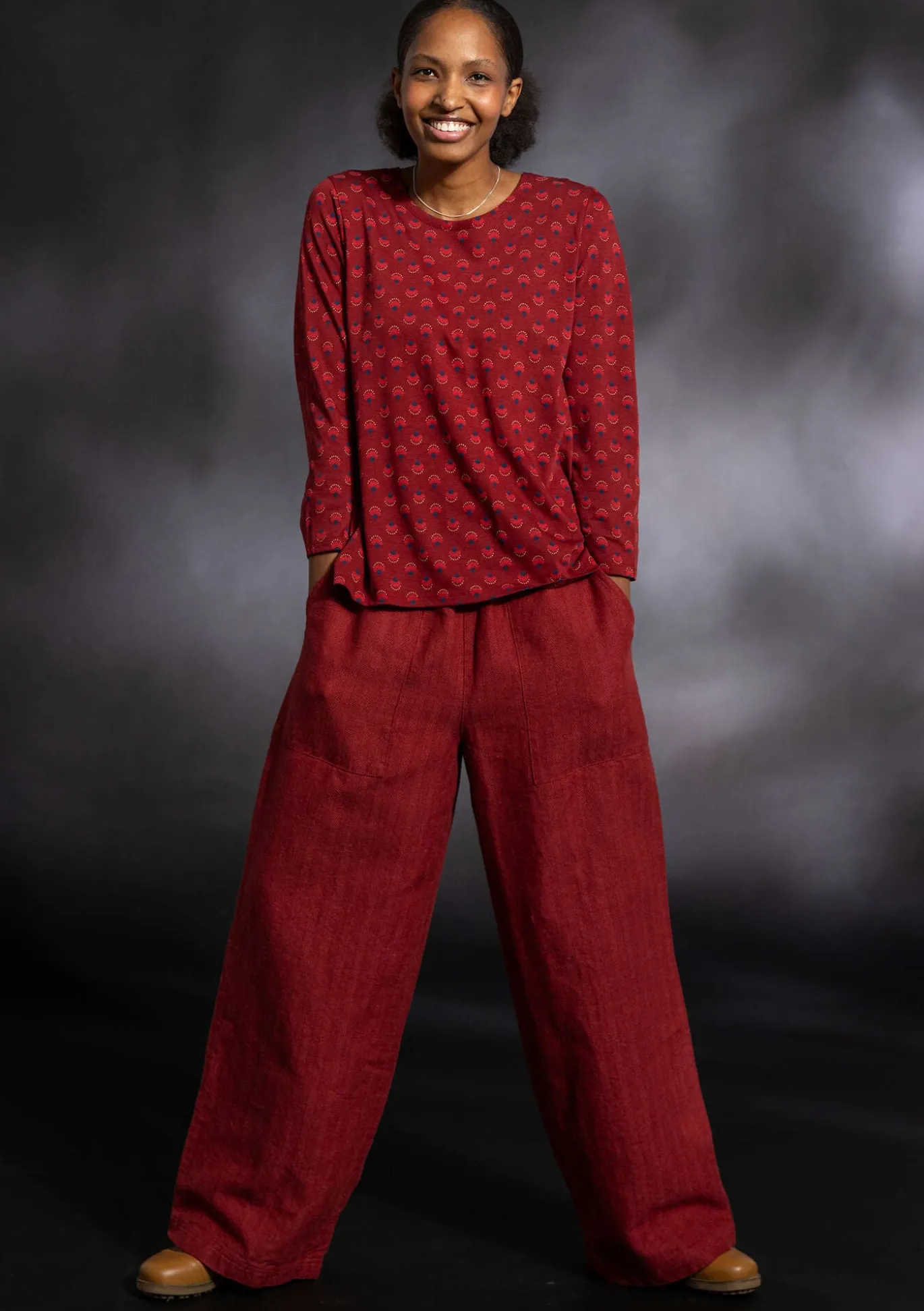 Täyspitkät housut kalanruotokangasta. Mukava resori vyötäröllä ja leveät lahkeet. Edessä paikkataskut. Ommeltu jäännöskankaista.