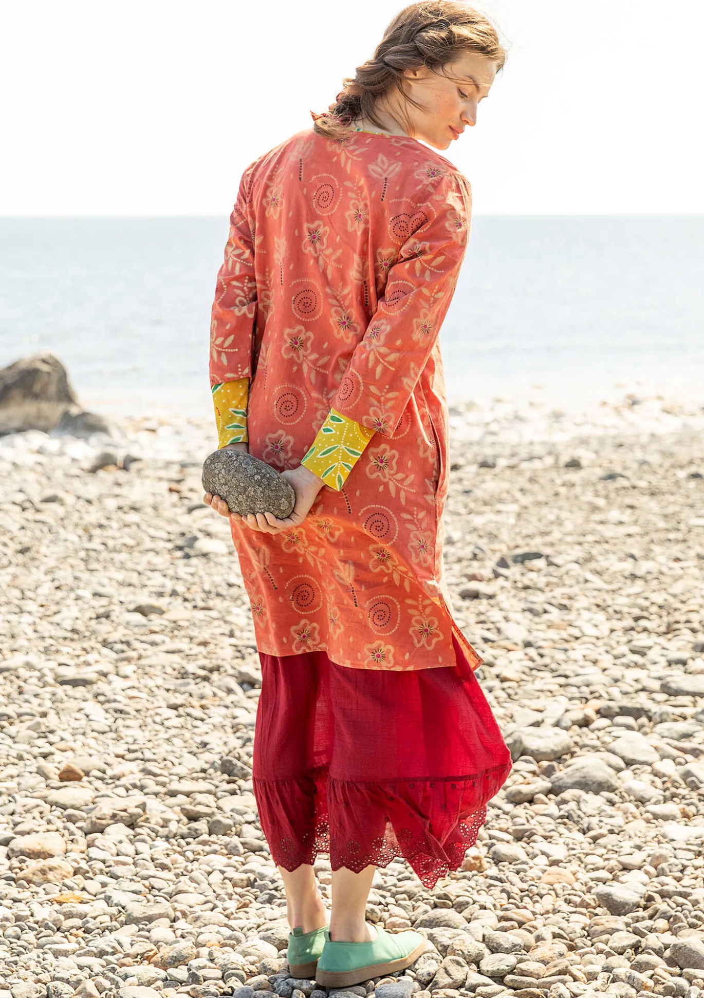 Alas asti napitettava mekko, jonka kuvio on tehty laattapainannalla, estovärjäyksellä ja kasvivärjäyksellä. Pyöreä pääntie, pitkähköt 3/4-hihat ja kangaspäällysteiset napit. Sivuissa piilotaskut ja halkiot. Hauskana yksityiskohtana edessä on pieni halkio, josta pilkottaa toinen kuvio.