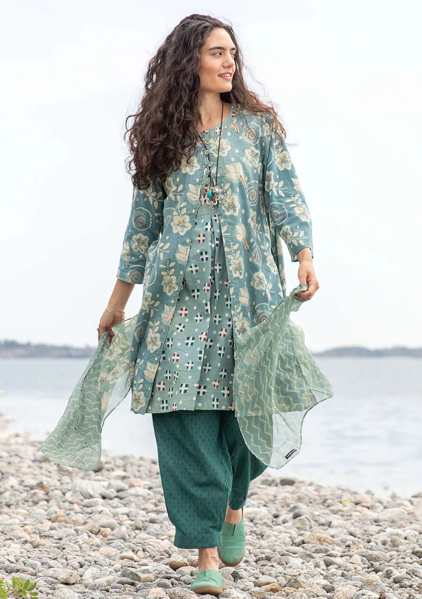 Alas asti napitettava mekko, jonka kuvio on tehty laattapainannalla, estovärjäyksellä ja kasvivärjäyksellä. Pyöreä pääntie, pitkähköt 3/4-hihat ja kangaspäällysteiset napit. Sivuissa piilotaskut ja halkiot. Hauskana yksityiskohtana edessä on pieni halkio, josta pilkottaa toinen kuvio.