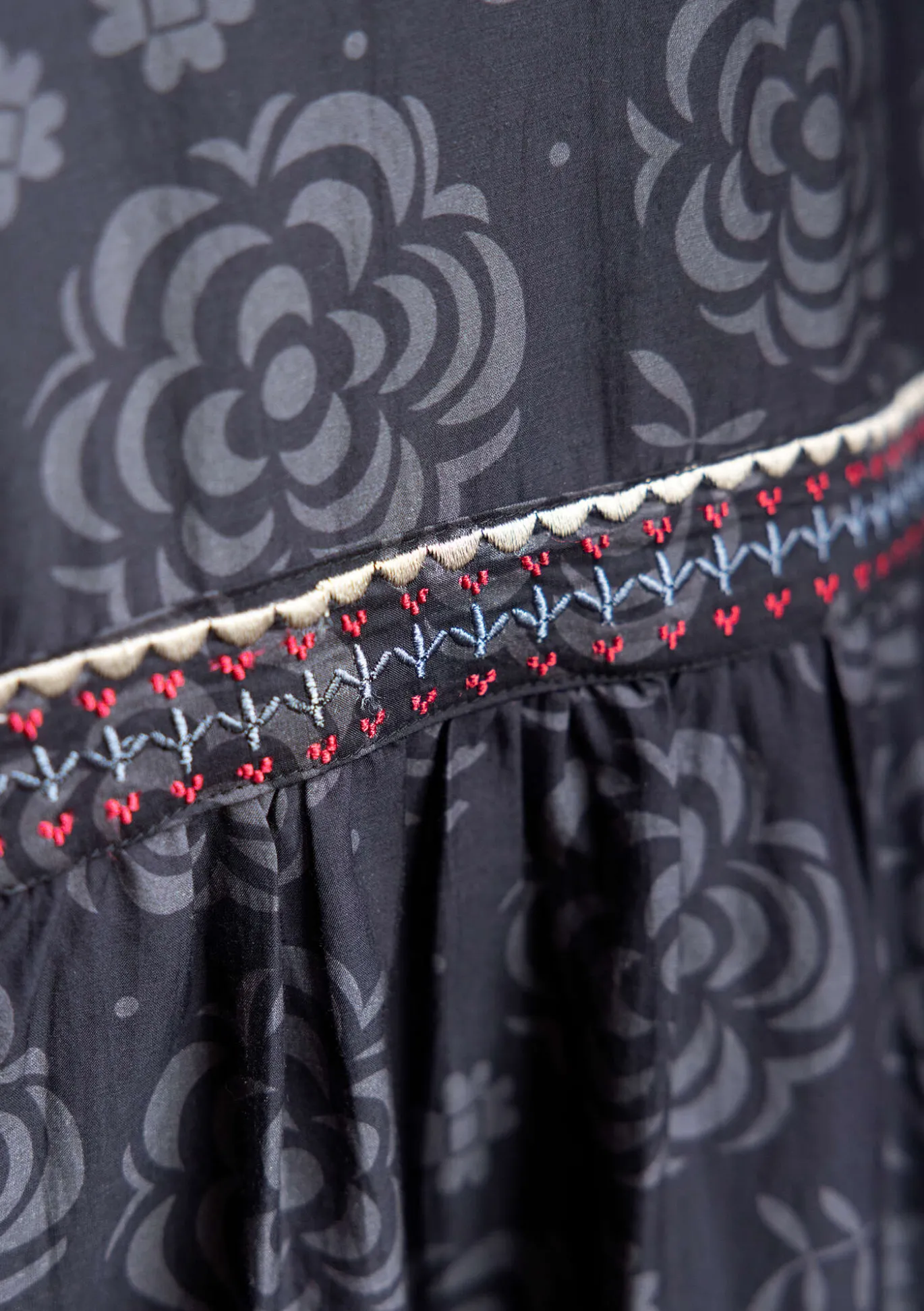 Digipainettu pitkä mekko, joka on ommeltu kaitaleista ja jossa on rypytys. Kirjailu miehustassa ja kaitaleissa. Nelikulmainen pääntie, 3/4-hihat, hieman levenevä helma ja hihoissa upotettua pitsiä. Sivutaskut sekä vyötärösaumassa upotettu tasku ja koristeelliset kirjailut.